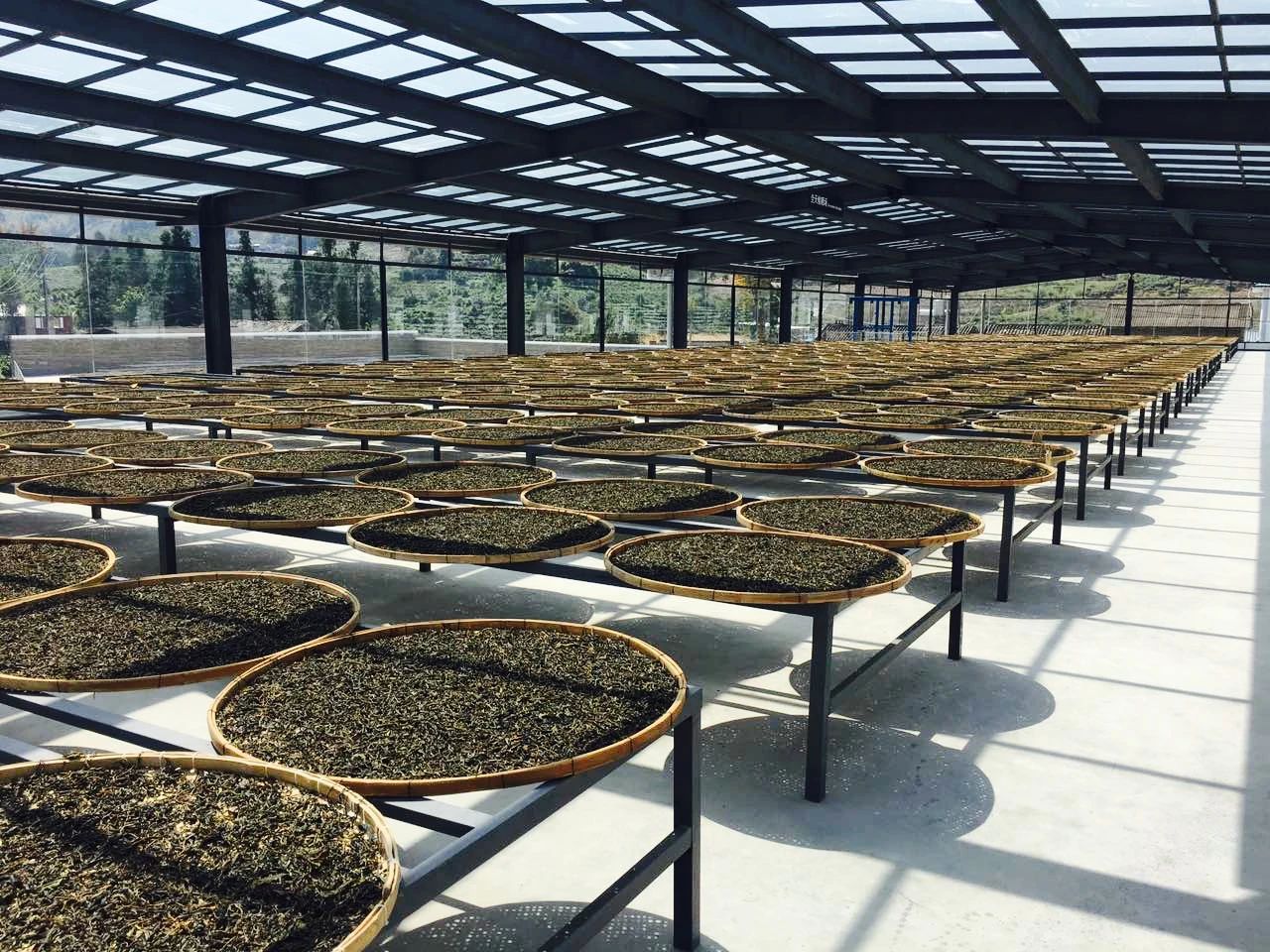 茶叶揉捻好后,放到晒场进行纯阳光晾晒干燥,晒制过程中需要适时翻动,晒干的温度、时间都需要通过经验丰富的工艺师来把控。相比工业干燥,阳光晒干更好的保留茶品活性和阳光的香气,这也是普洱茶后期越陈越香的基础。