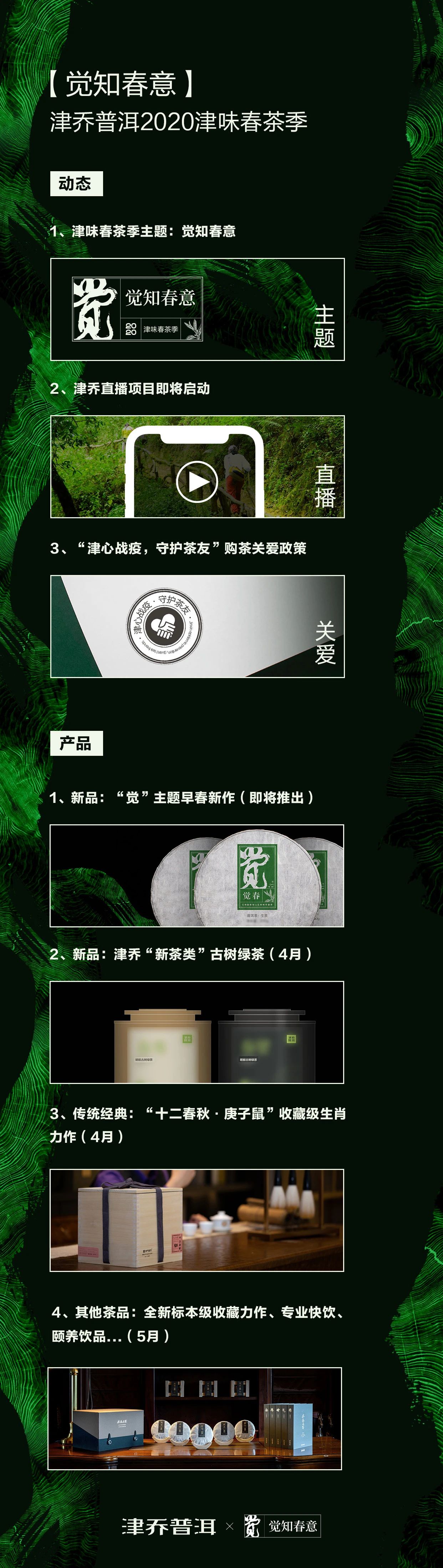 以上来看2020春茶季的产品有了很大的革新,优化后的产品线也更加清晰和丰富;同时动态方面,津乔直播开启、疫情下的“守护茶友”政策,都体现了“津乔温度”。