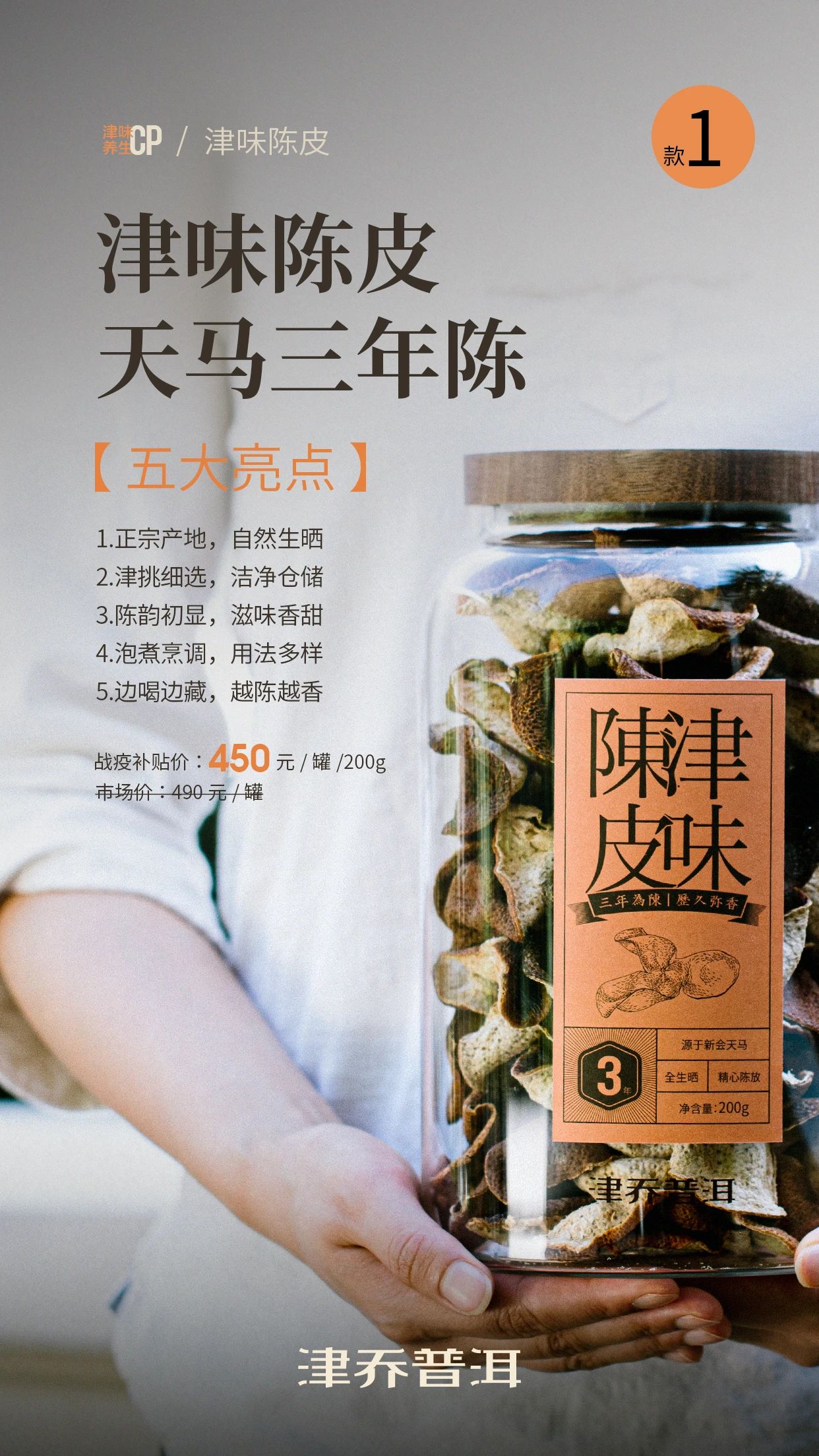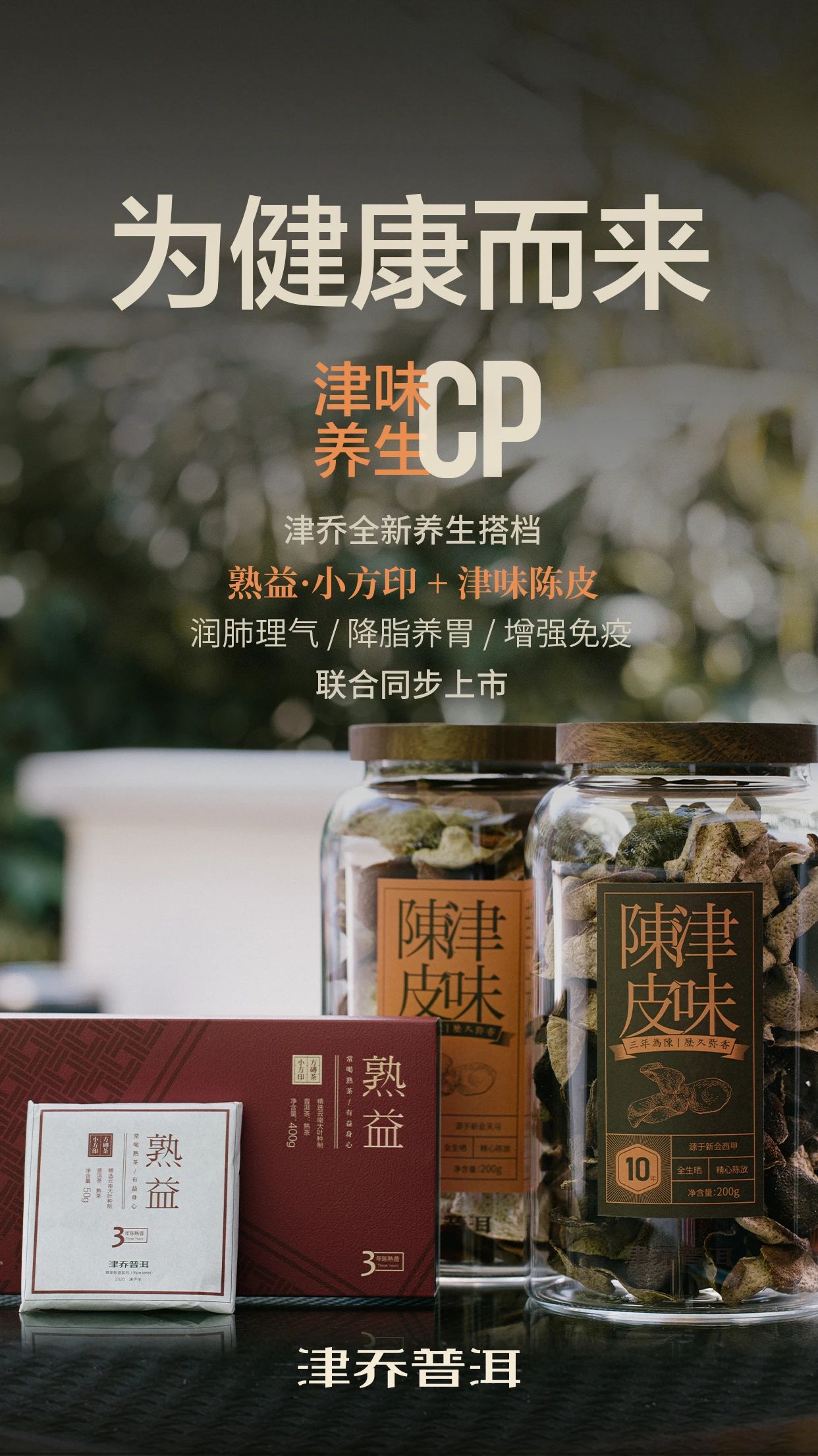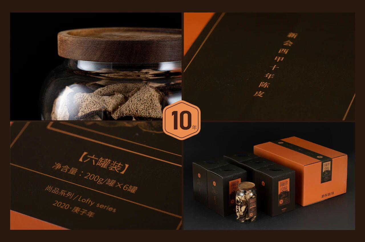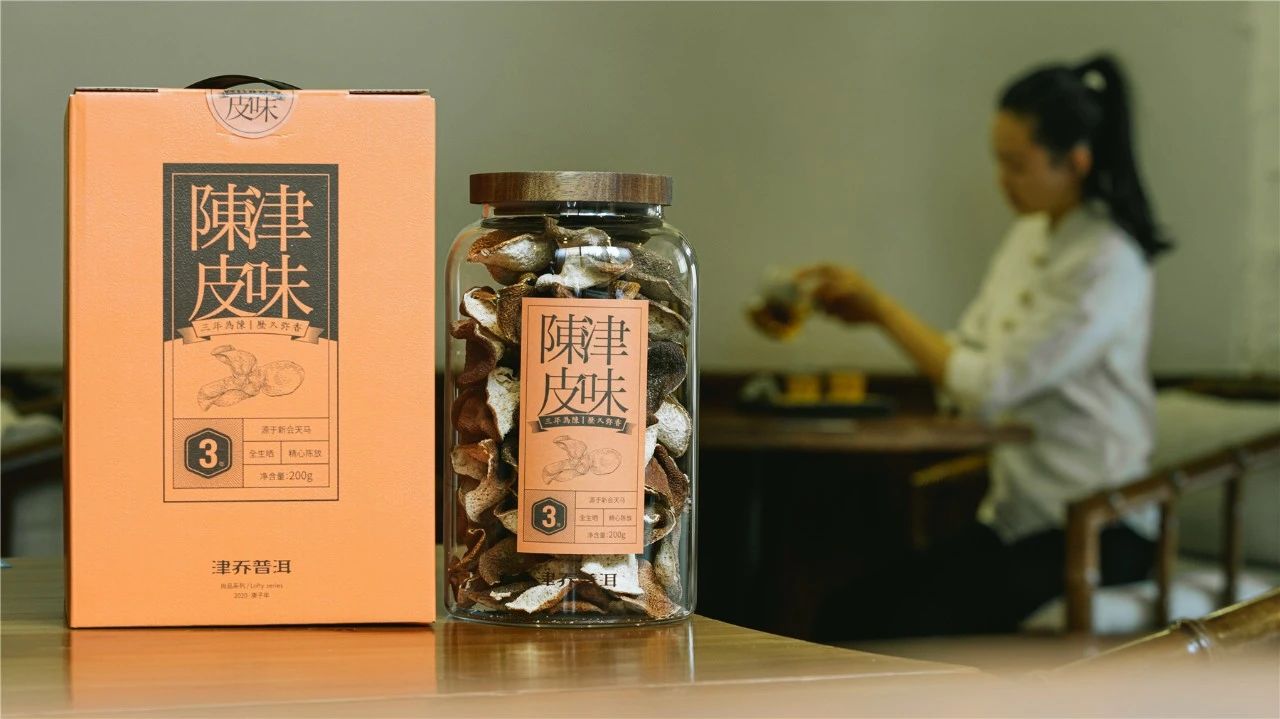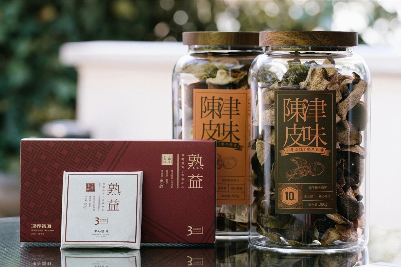 陈皮与熟茶,皆有养生功效。陈皮能够舒肝润肺、增强免疫;而熟茶能够健脾养胃、降脂养颜,两者既能单独清饮,陈皮甚至还是烹调煲汤良好配料。津乔选择两款同时推出,也是给到大家更多对于不同养生需求的自主选择。