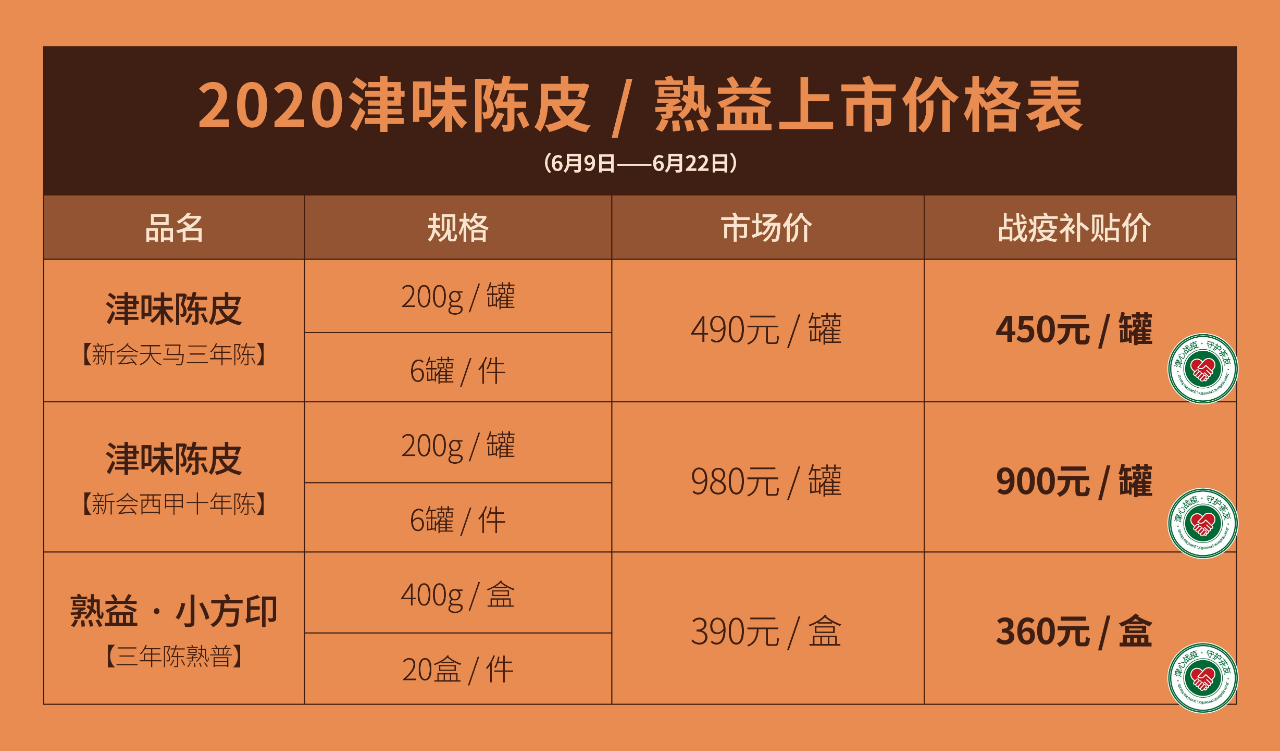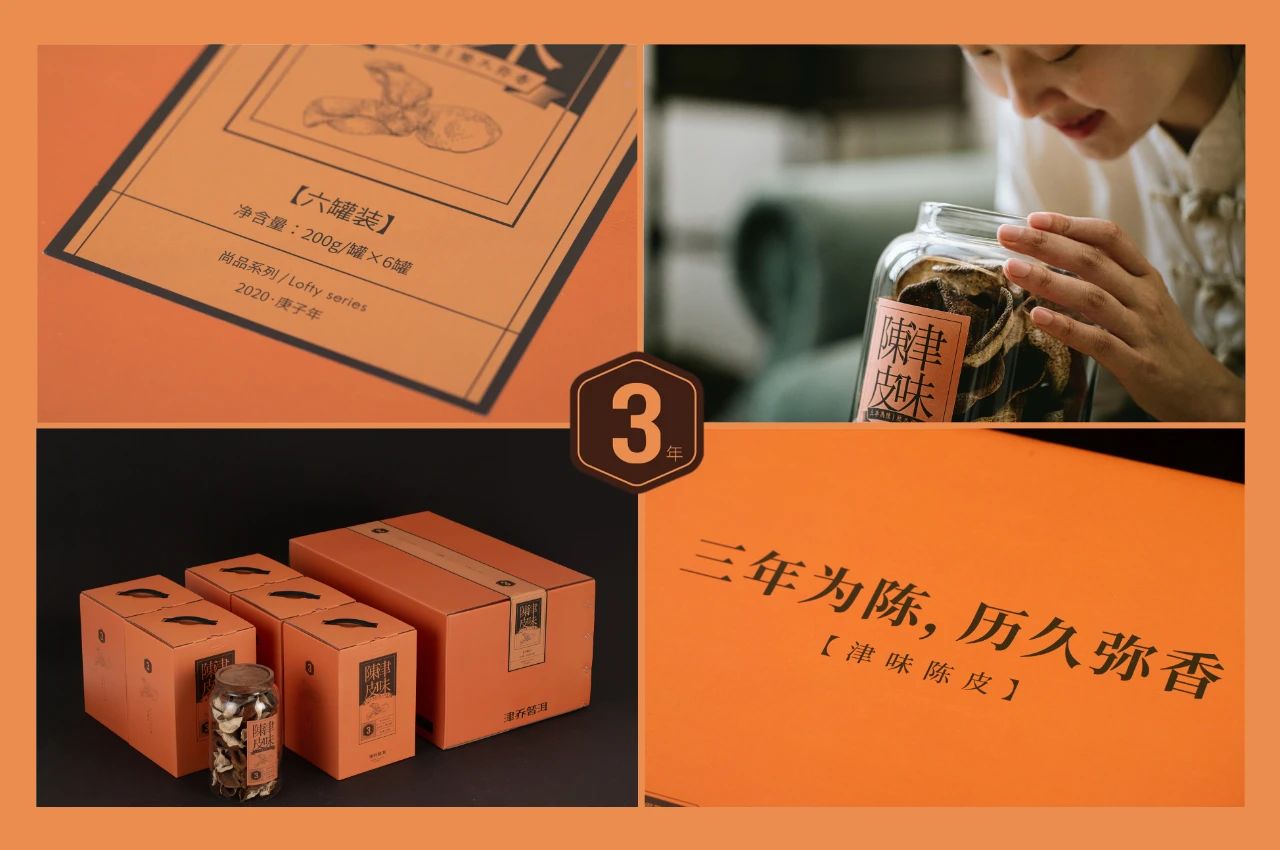 津味养生CP,以三款全新单品推出:津味陈皮(天马三年陈)、津味陈皮(西甲十年陈)、熟益·小方印。
