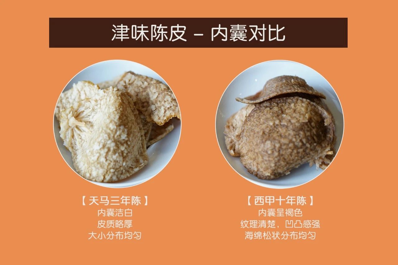 “三年陈”色泽橙黄泛褐,皮质略软;