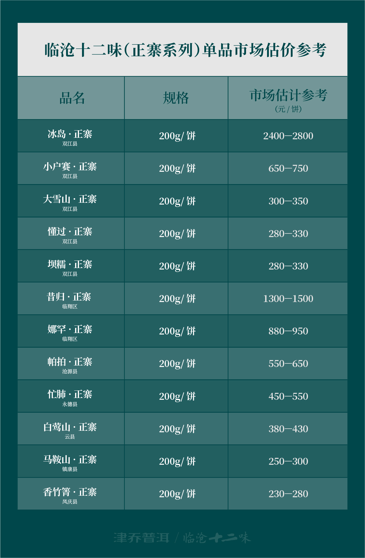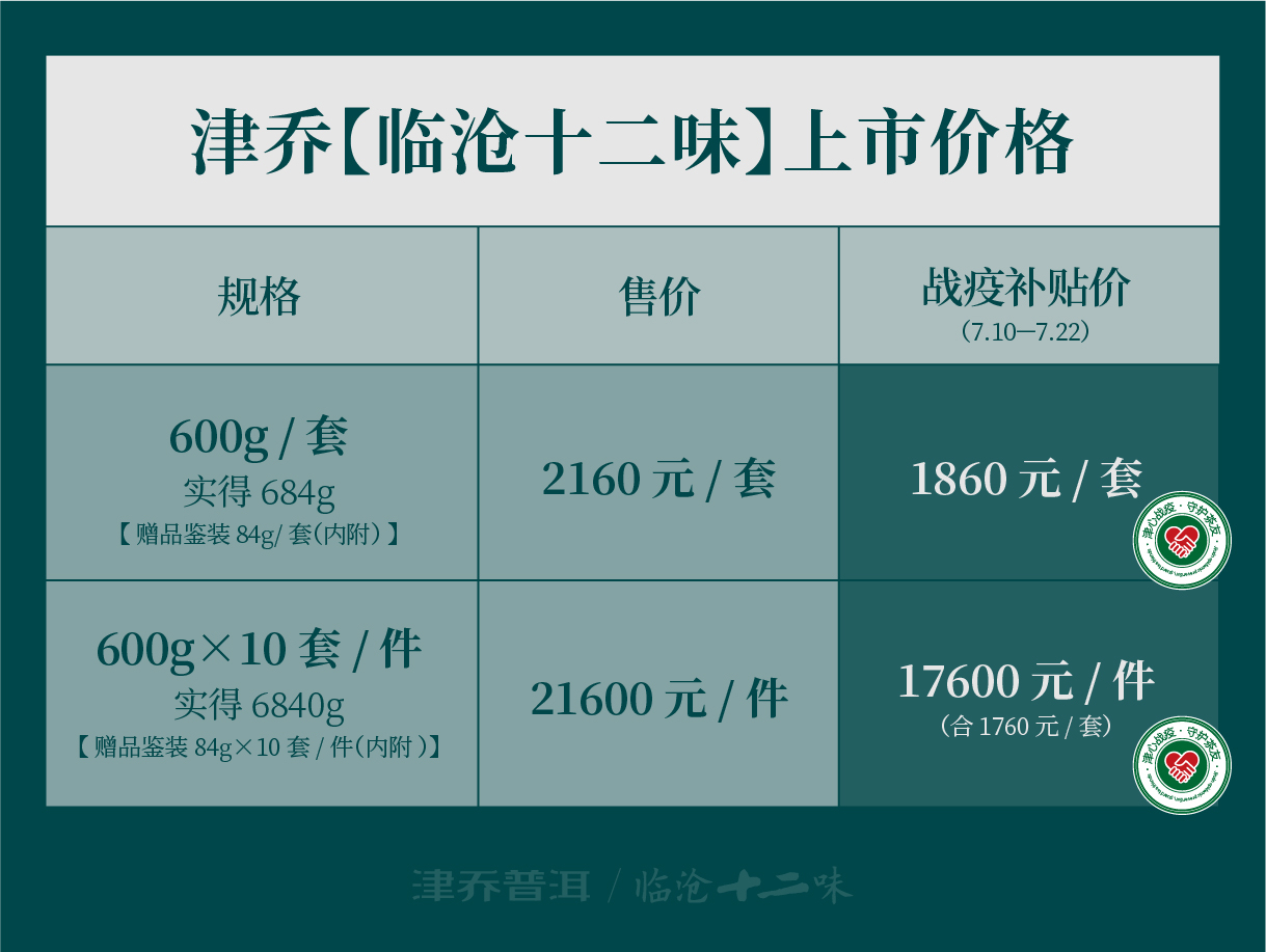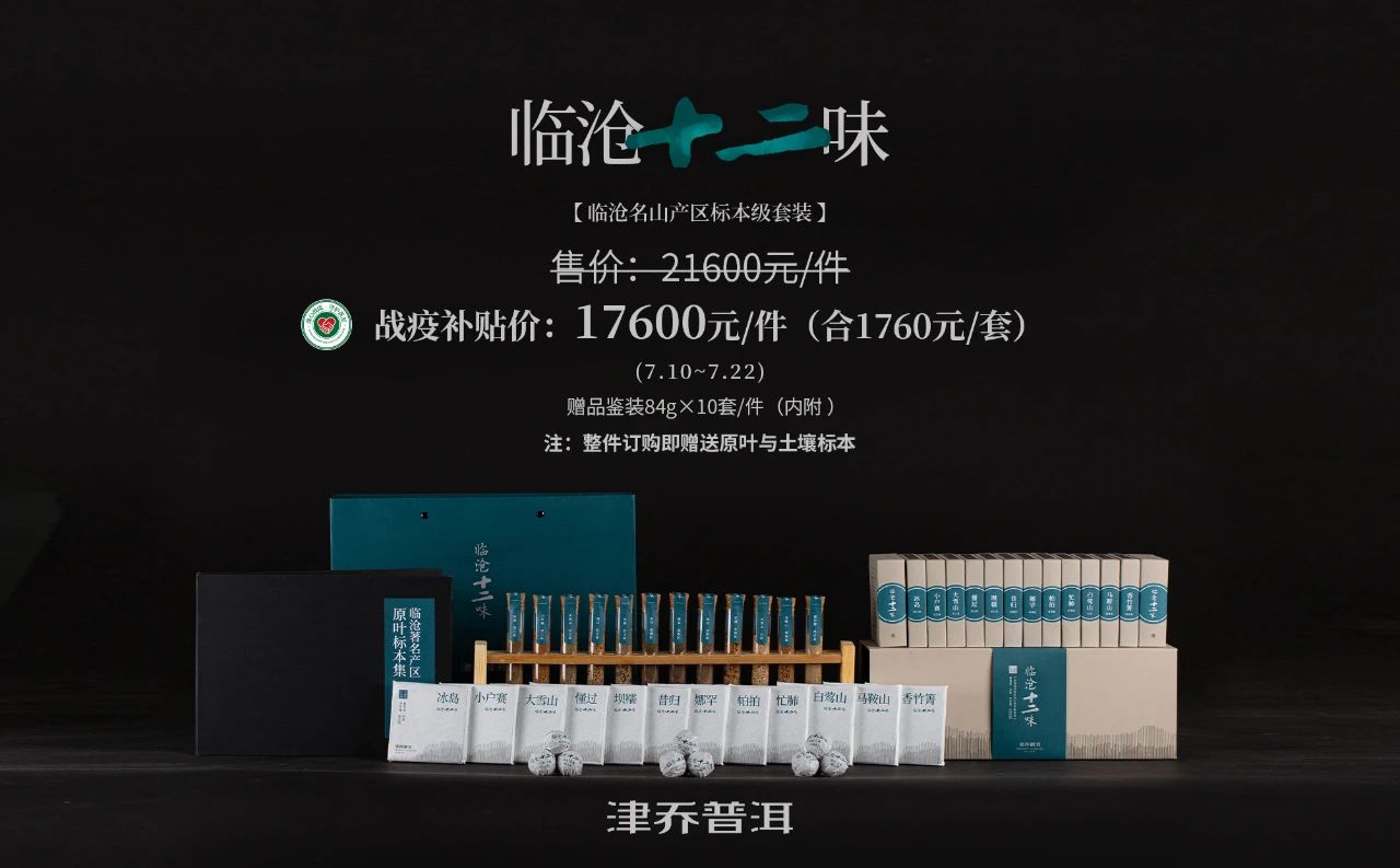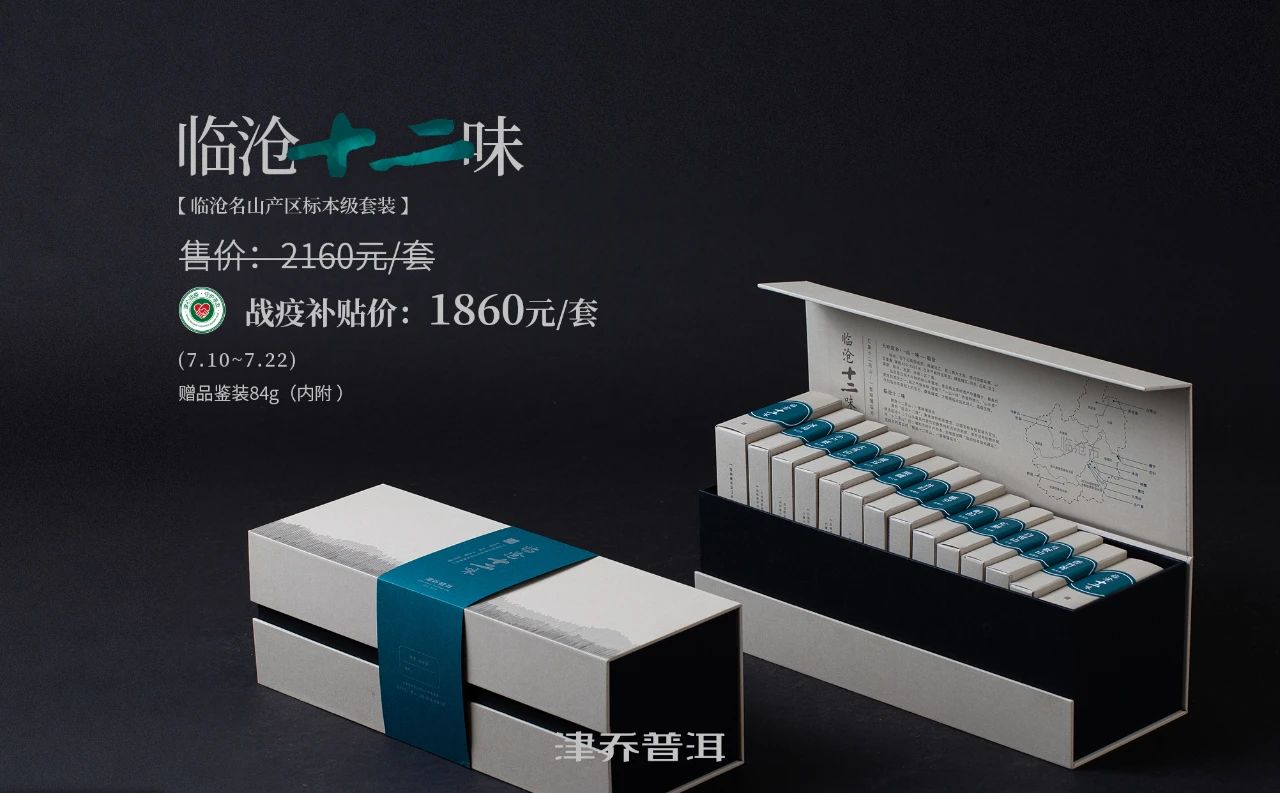 临沧十二味精选2020年各山头上佳古树春料制作,虽春茶干旱减产原料珍贵,但基于疫情多重影响,为给予津粉力所能及的关爱,津乔茶业特别给到政策支持:即日起订购可享受战役补贴价,7月22日后恢复2160元/套。