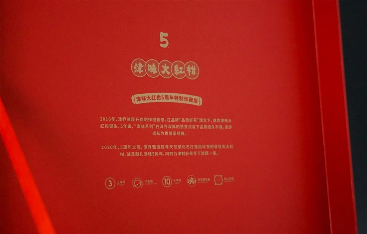 自2016年起,津乔开始制作陈皮普洱,5年来初心不变,专注如一:2020年,5周年到来之际,津乔茶业特选精品珍稀原料,年末首发限量珍藏版,献礼重要时刻。