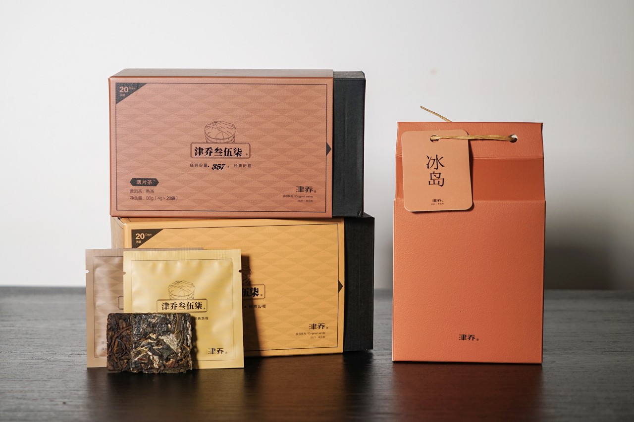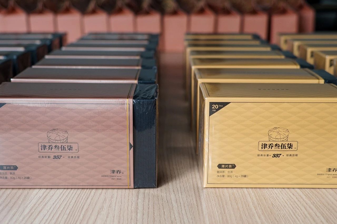其中一份,是在春季提前预留下的“冰岛壹号”散茶1盒。另外两份,是刚刚上市的品牌标杆茶:“津乔叁伍柒®”(薄片茶)普洱生茶、熟茶各1盒