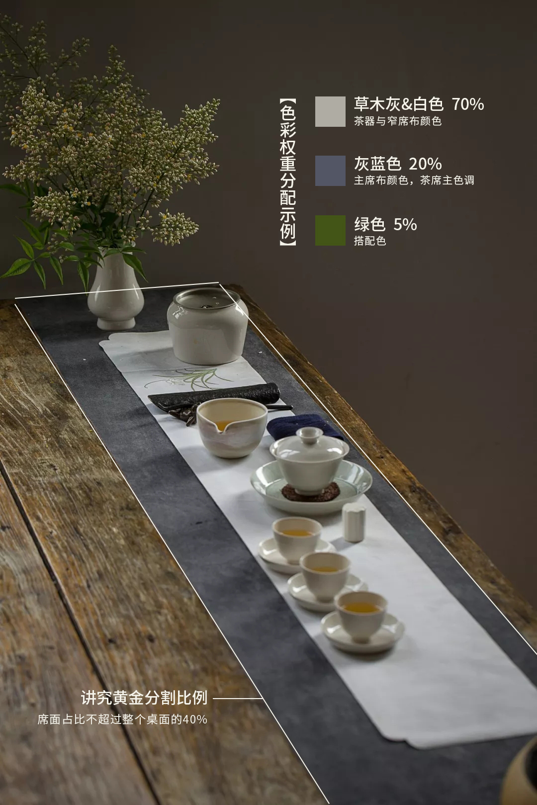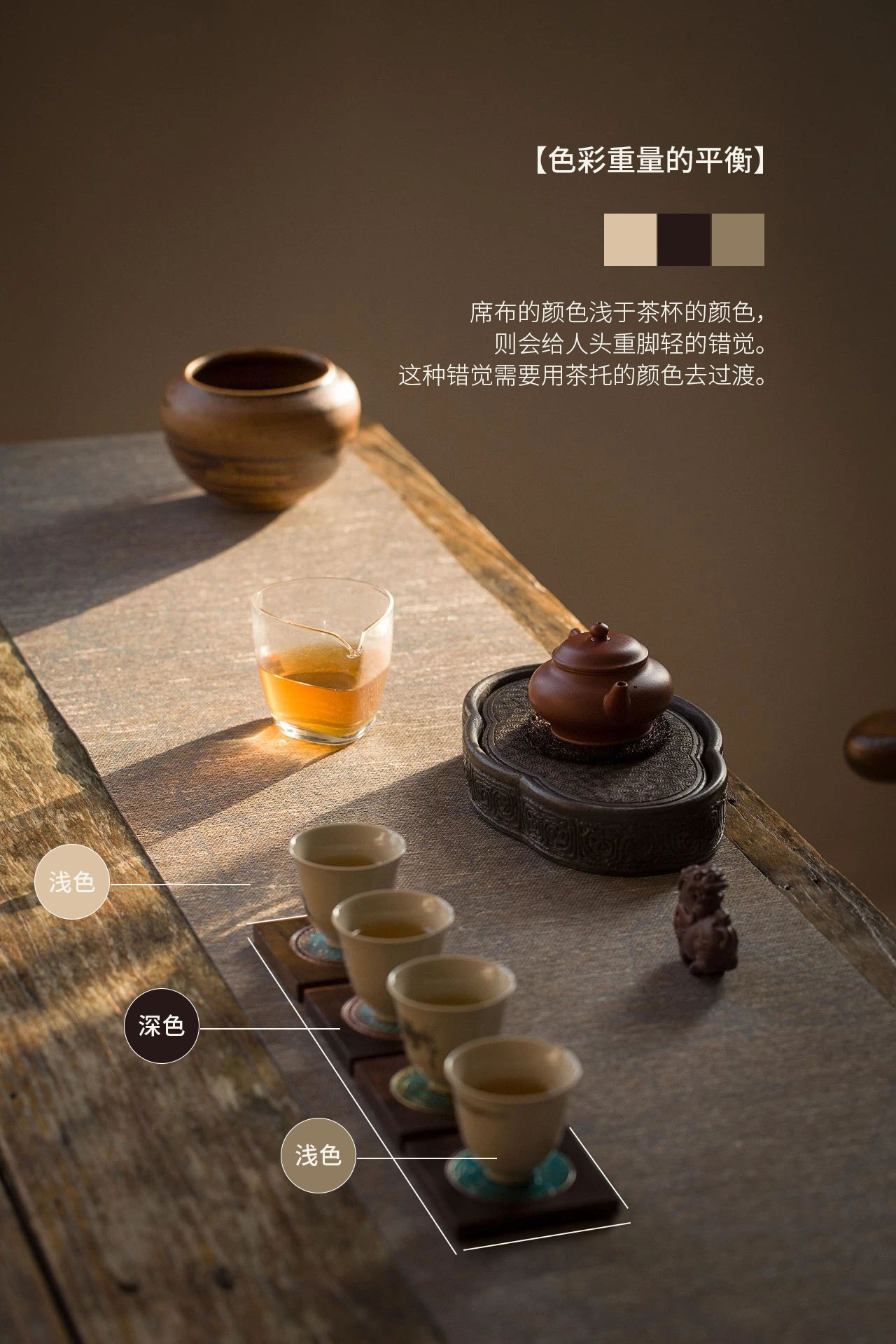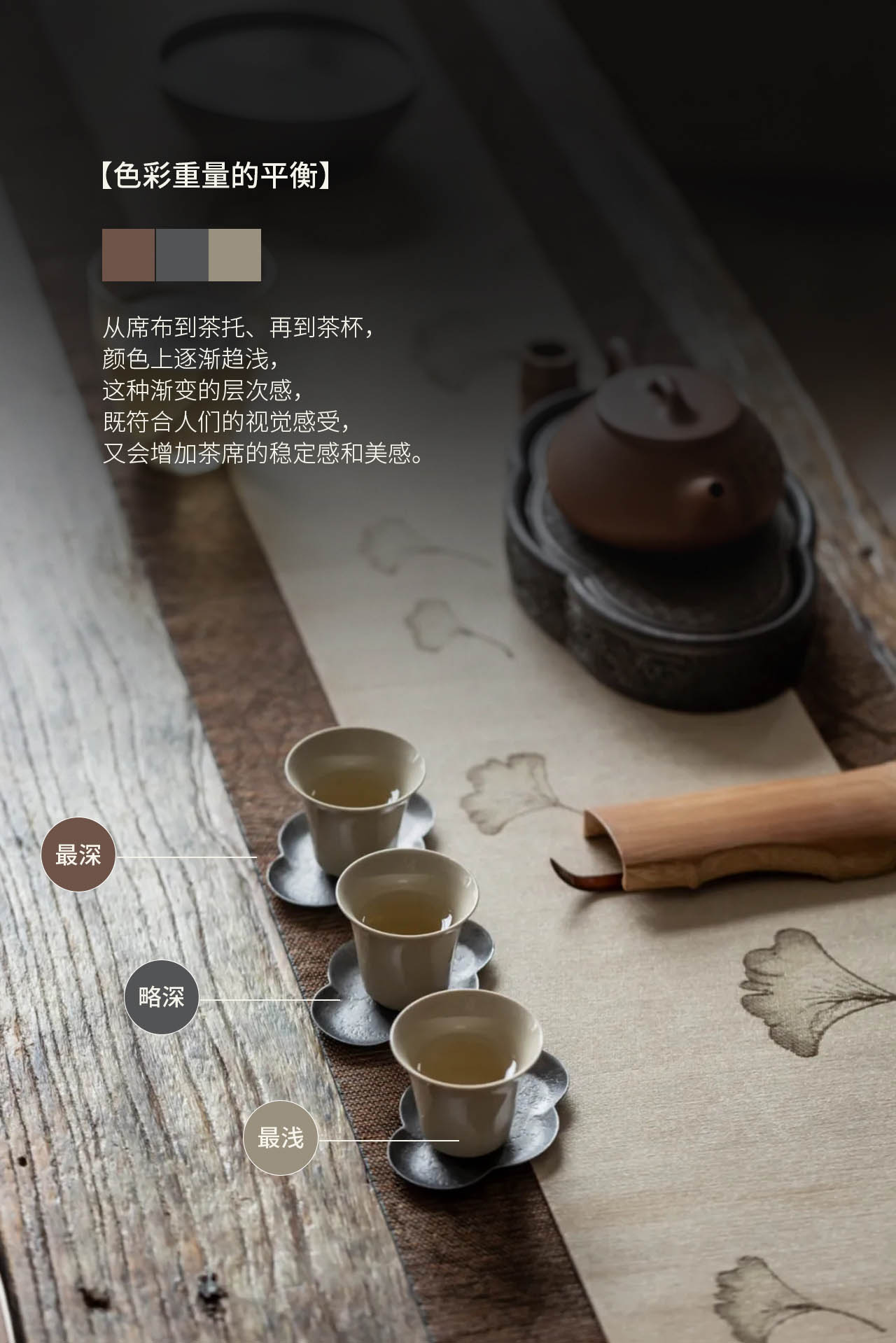 最好是从席布到茶托、再到茶杯,颜色上逐渐趋浅,这种渐变的层次感,既符合人们的视觉感受,又会增加茶席的稳定感和美感。