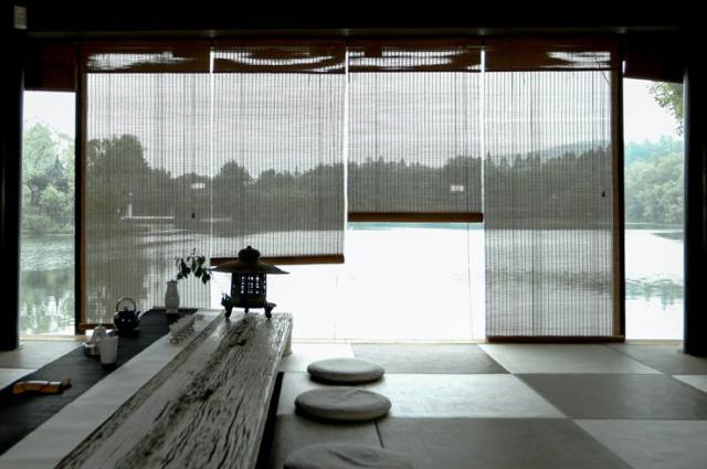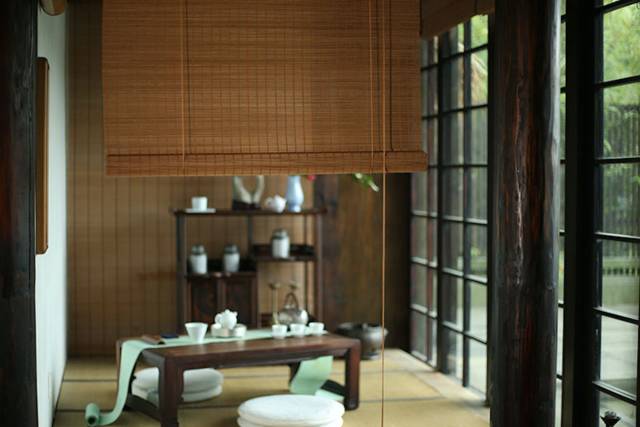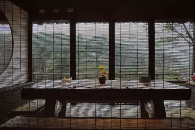 在茶席设计中,尽可能用好“隔”的概念。如茶席上的插花,如果过于鲜艳夺目,可以挂一半透的竹帘,使之花韵隐隐透出。
