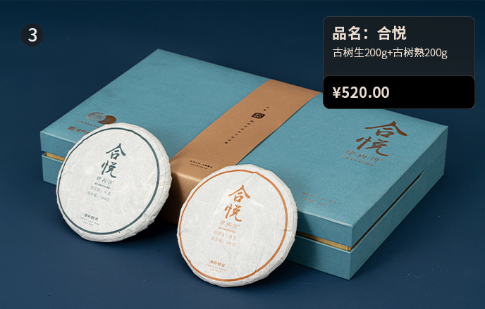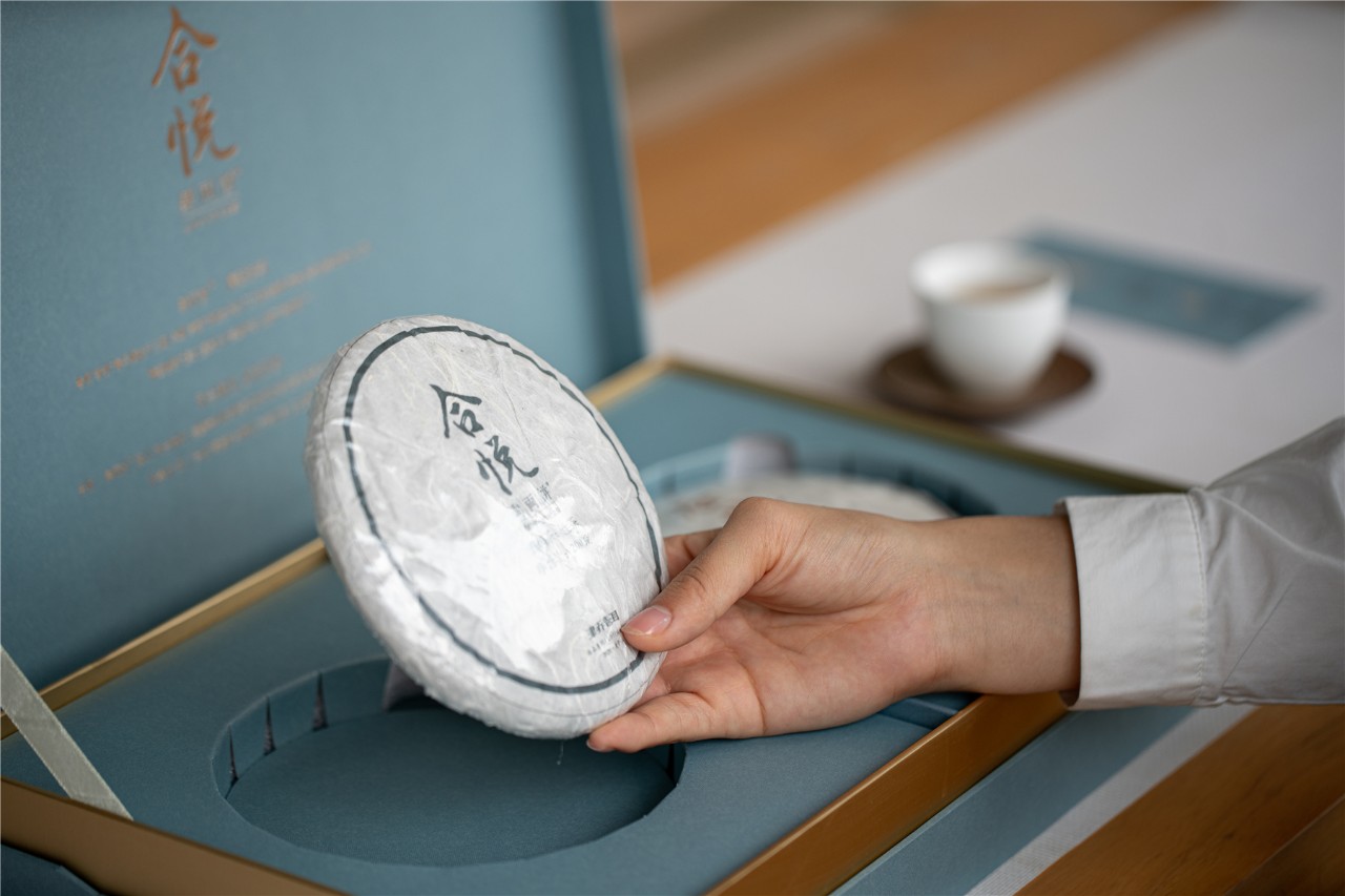 “合悦”礼盒涵纳生熟双饼,生茶精选古树春茶,韵味深远回甘持久;津制古树熟茶汤感醇厚,甘甜细腻。茶品有好事成双、和合喜悦等诸多美好寓意,礼盒色调高级雅致,是中秋上佳礼选。