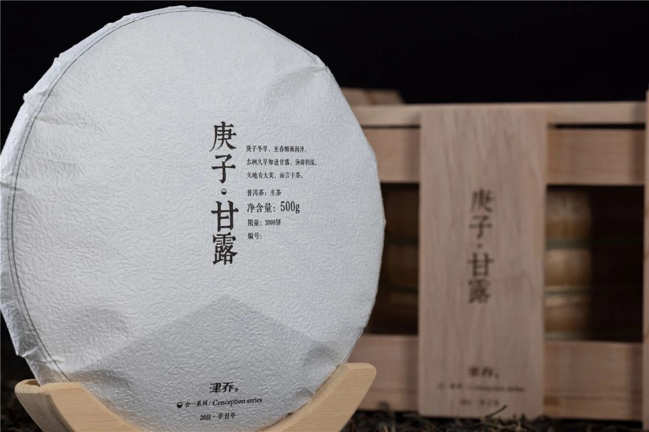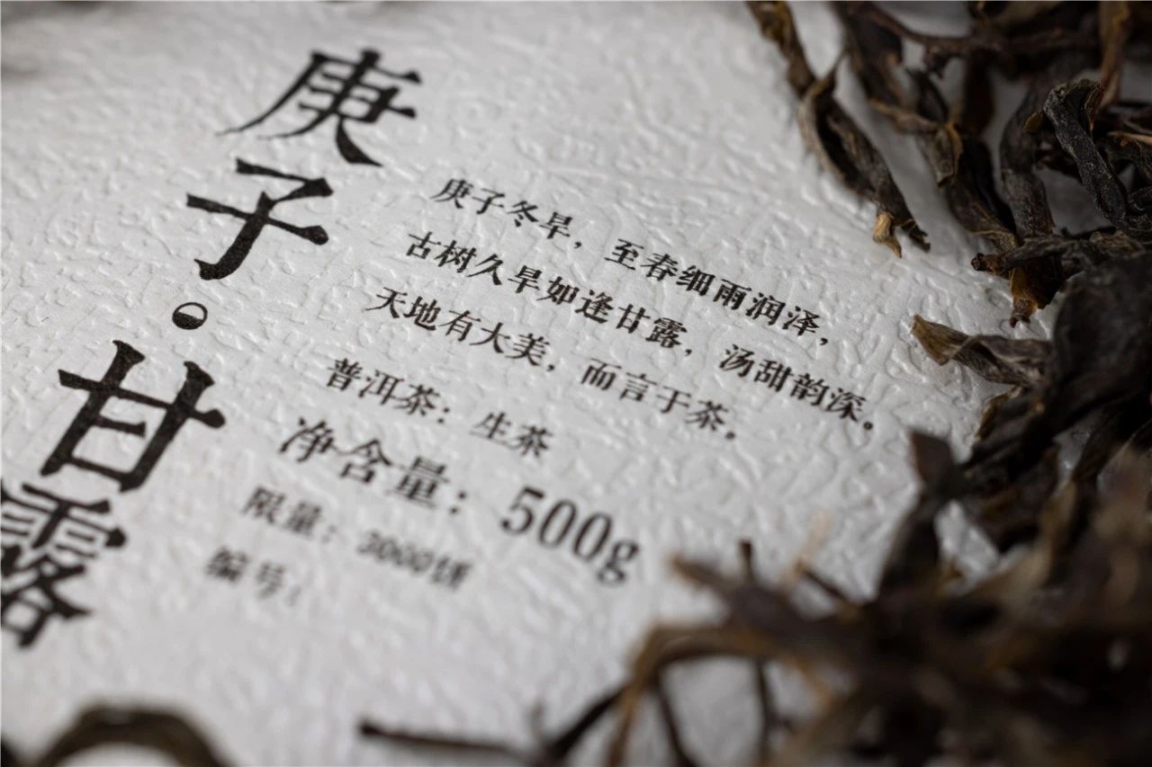 “庚子·甘露”因纪录庚子冬季,久旱的茶山终于在春末盼来了雨水,茶山焕发生机,旱霖相交,酝酿出别样茶质韵味。茶品延续500g/饼收藏份量制作,因2021年原料减产,仅能限量制作2000饼。