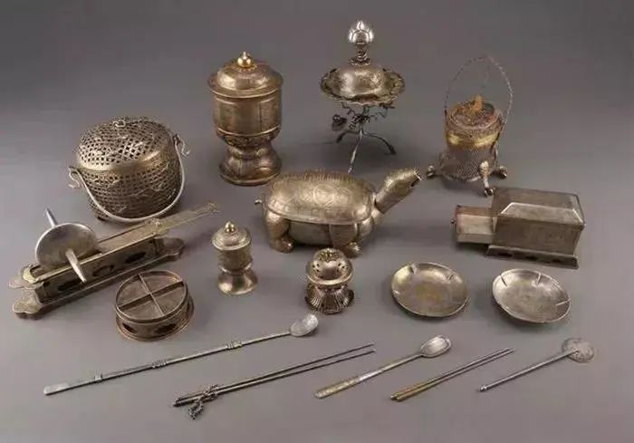 △ 陕西法门寺地宫出土的唐代宫廷金银茶具