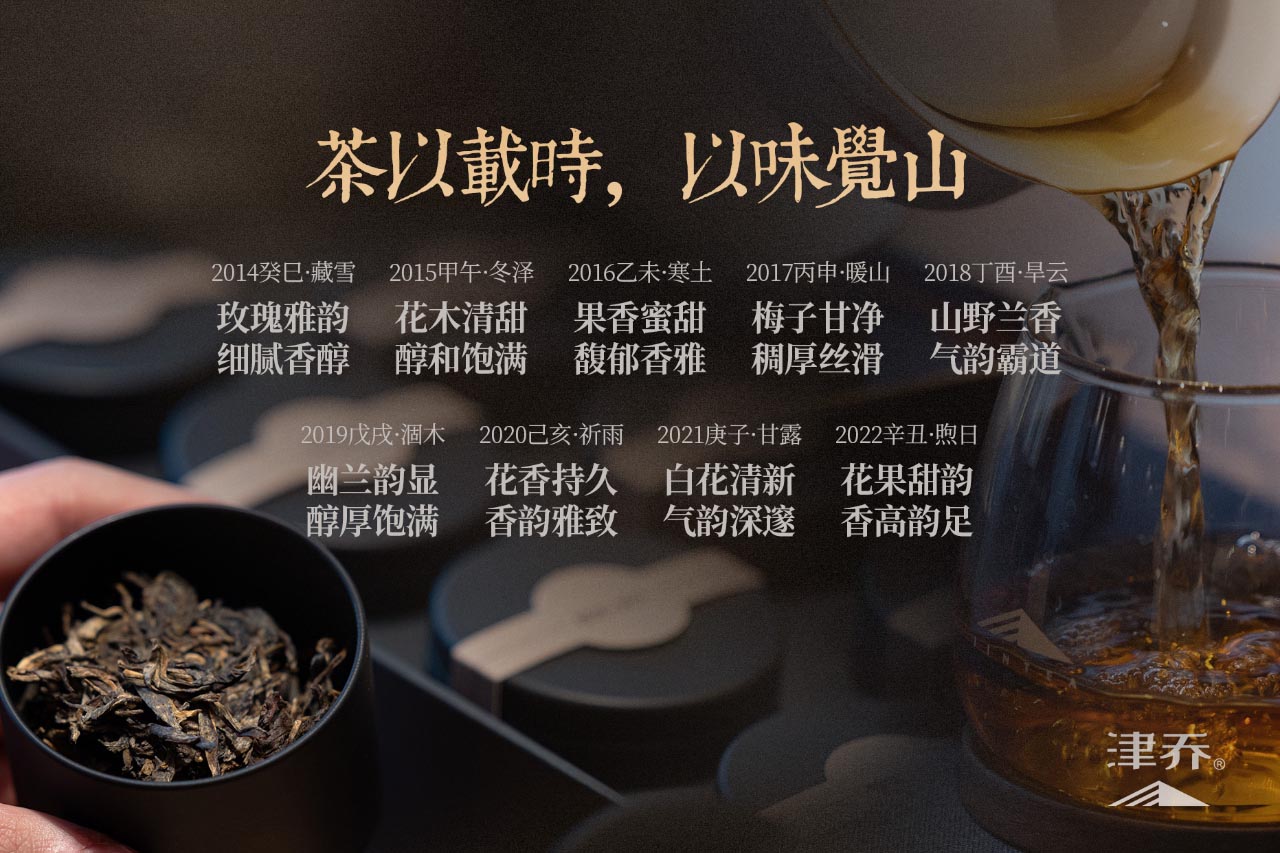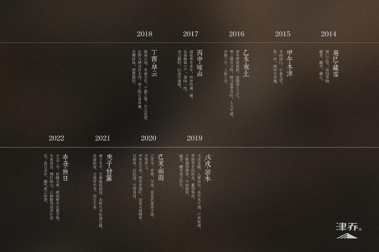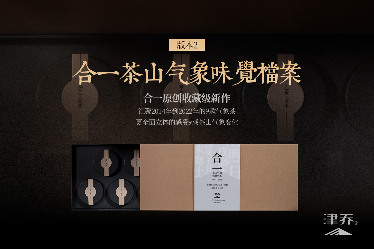 值此合一气象茶出品9年之际,津乔还特别推出汇聚2014 年到 2022 年的 9 款气象茶,融汇成一份绝美“茶山气象味觉档案”。