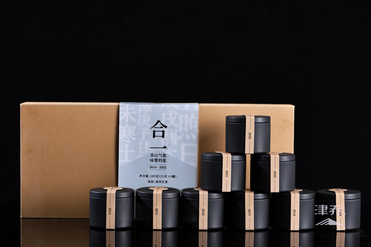 今年,津乔首次推出合一茶山气象味觉档案,汇聚2014年到2022年的9款气象茶,以21克/罐,9罐/套的独立罐装,让津粉更立体的感受9载茶山气象变化,品味气候对古树茶风格的影响。