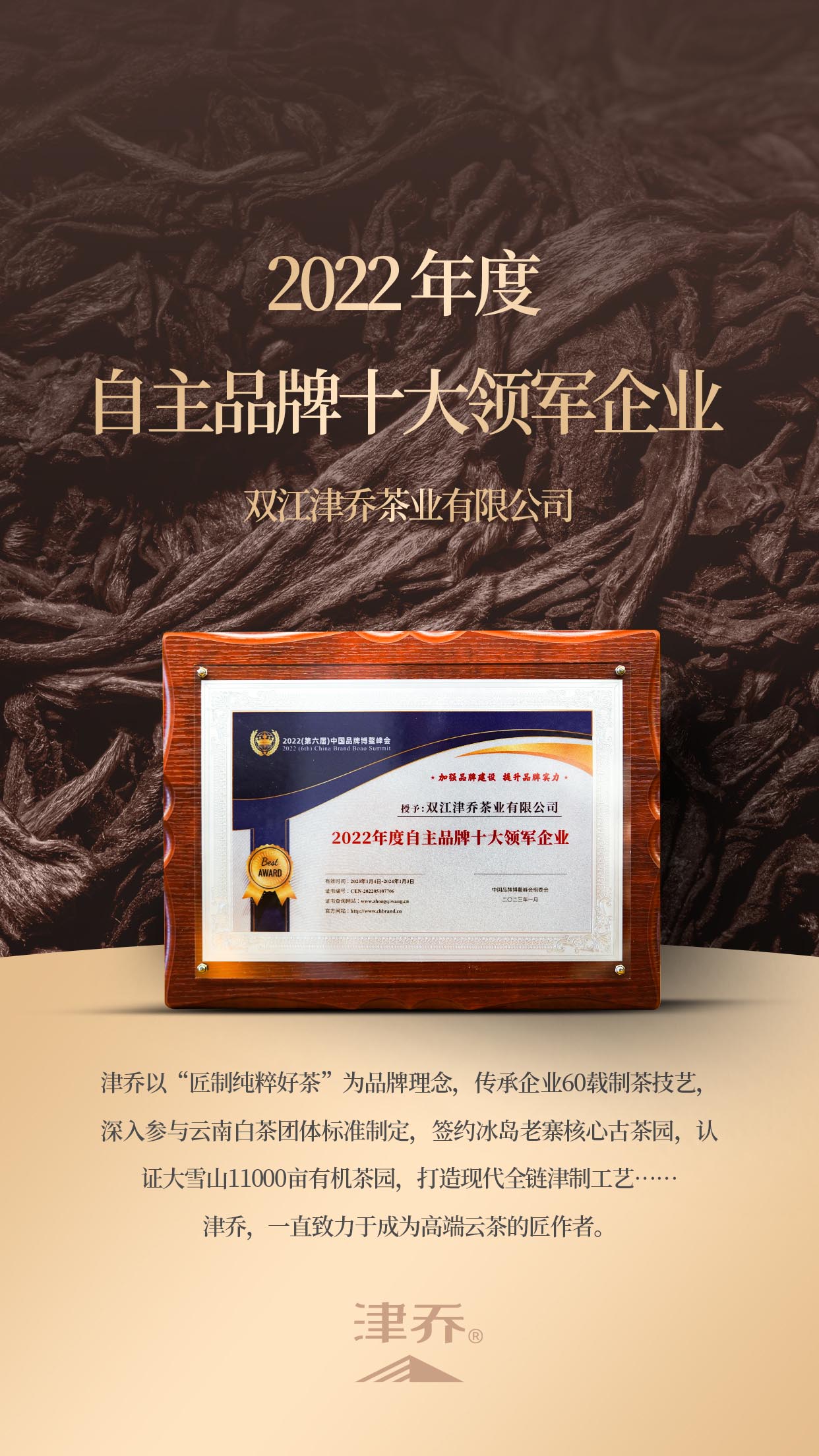 2022,津乔没有辜负每一位爱茶人士的厚望,立足茶时代,从品质、文化、生活的多元视角,持续深化品牌发展,荣获第六届中国品牌博鳌峰会“2022 年度自主品牌十大领军企业”奖项。