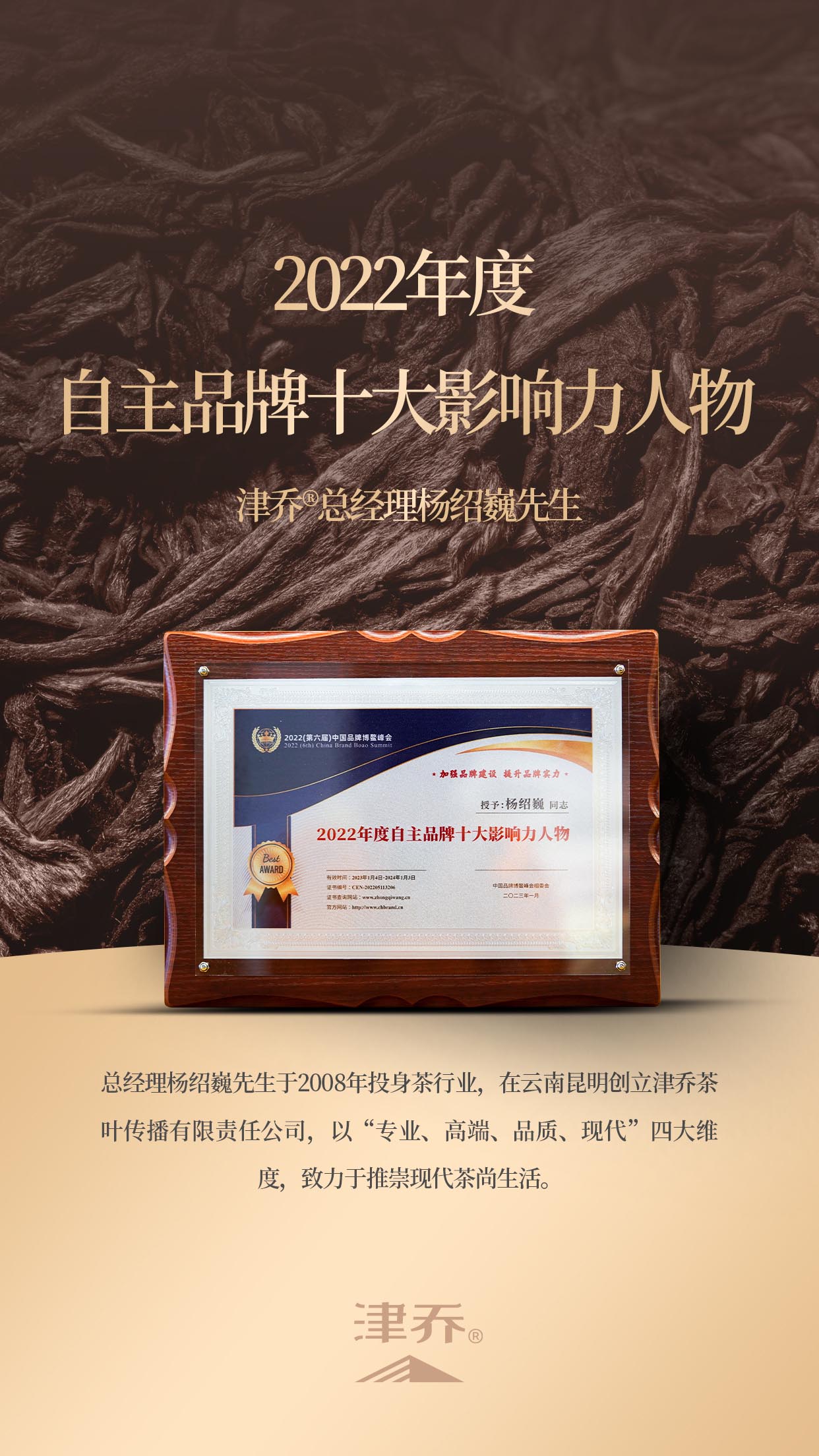 津乔茶业总经理杨绍巍先生获评“2022年度自主品牌十大影响力人物”,是对其打造出多款概念原创茶作品(如冰岛公元1485®、半藏™、十二春秋®等)和津乔独特品牌文化的认可和褒扬。