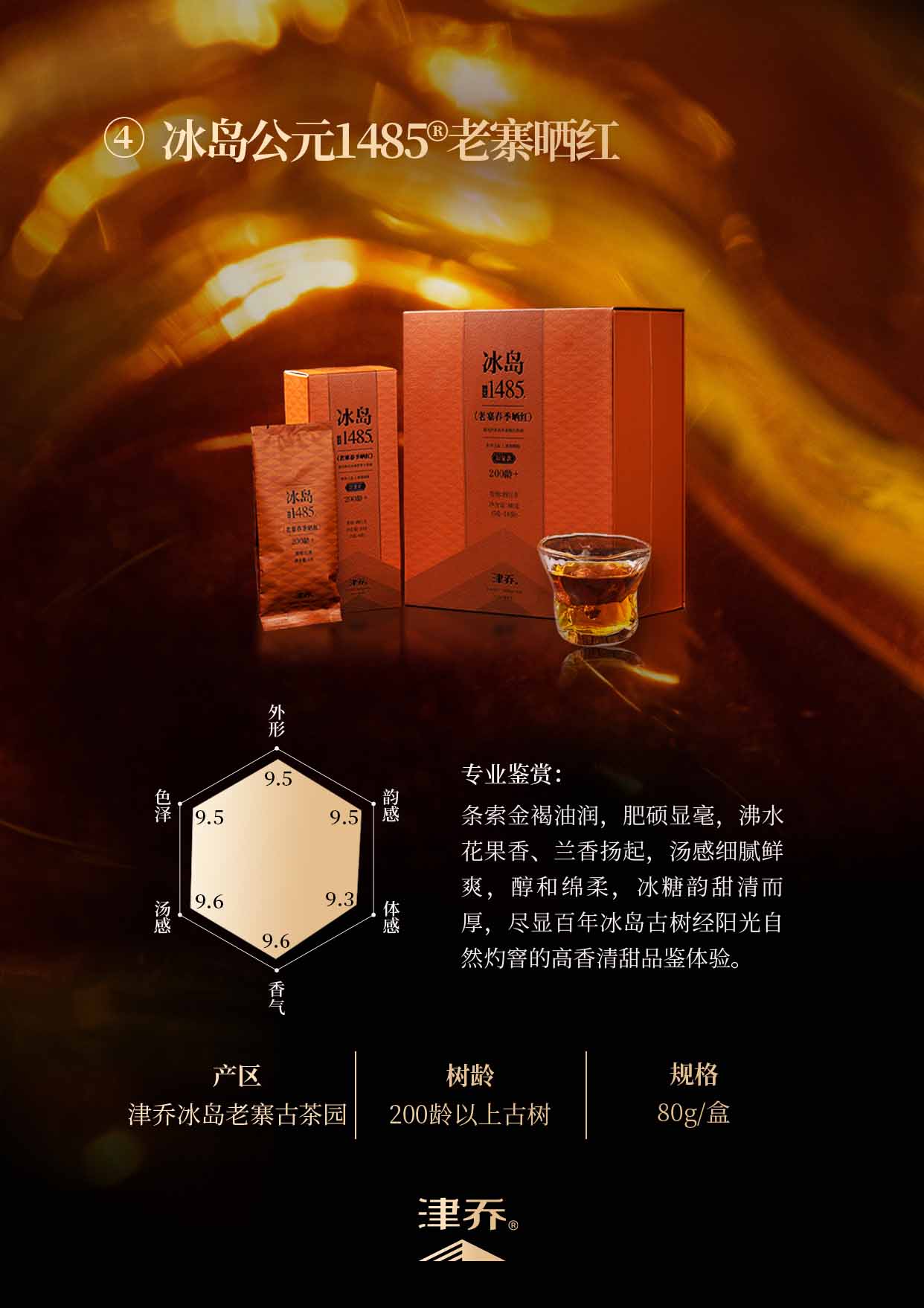 茶品延续冰岛公元1485®定位,精选津乔冰岛老寨古茶园核心区,树龄超过 200 龄以上的春季古树鲜叶制成,以45道津制工艺,诠释极致冰岛晒红甜韵。