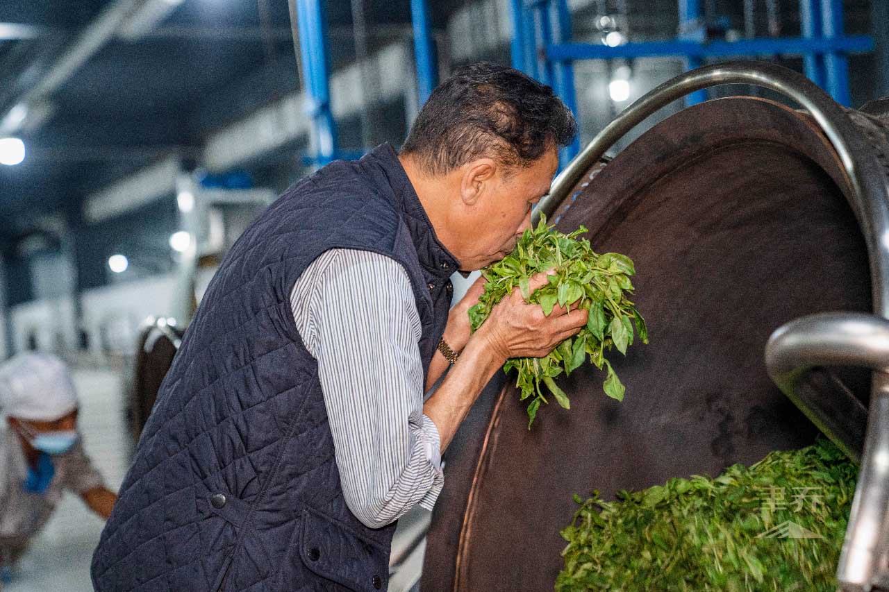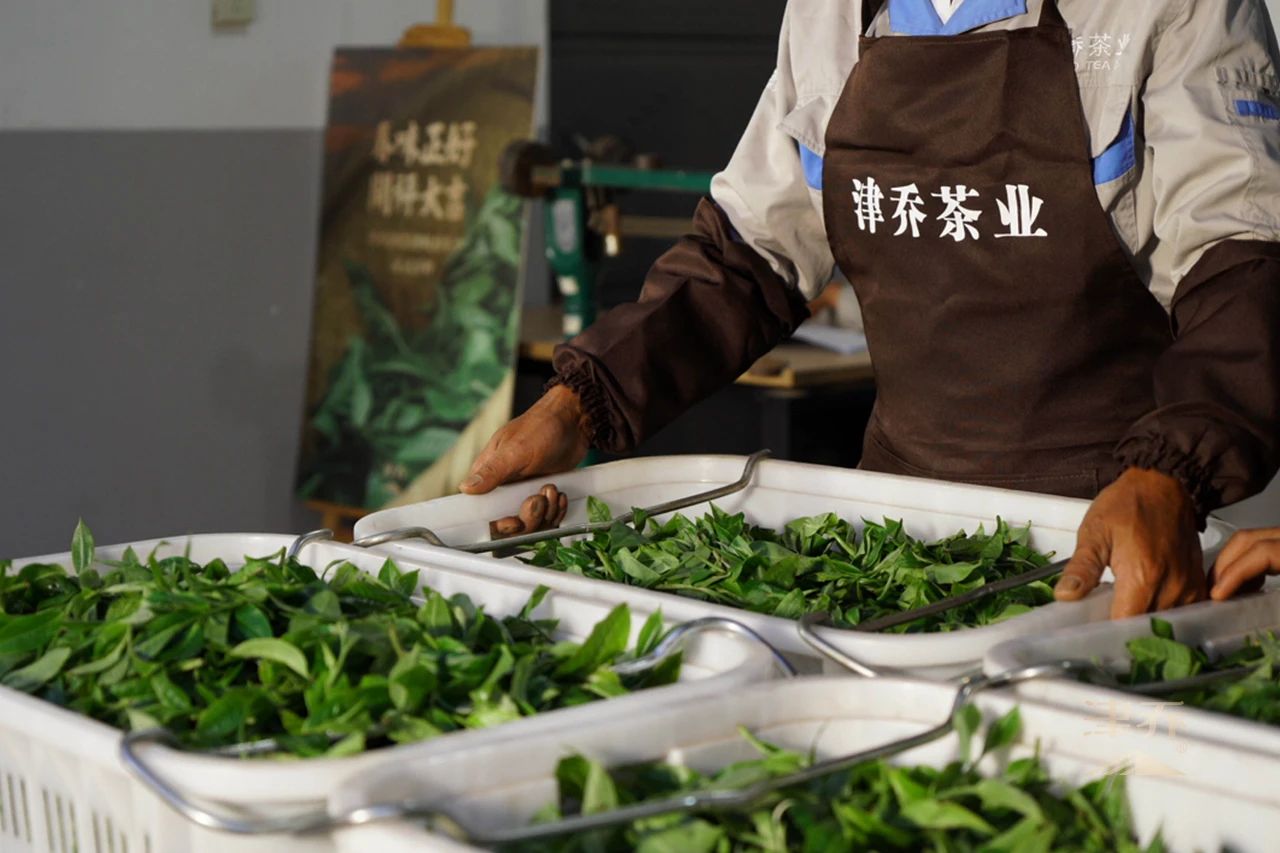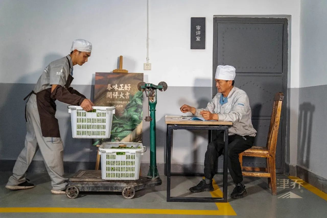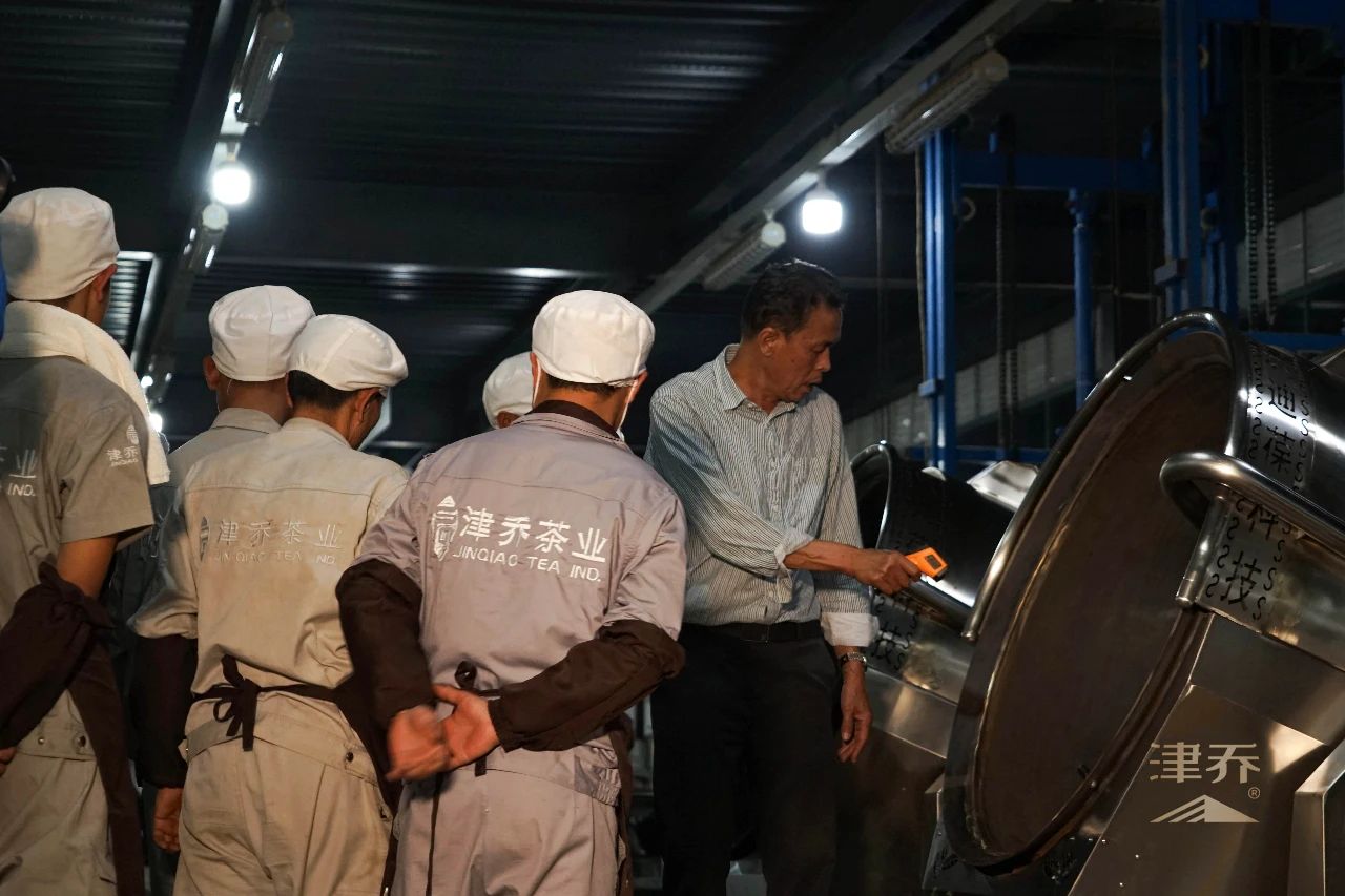 现场,茶人杨国成董事长依旧亲自督战津乔春茶季,带领团队长期驻点初制厂,在原料基地对鲜叶进行评定,并对初加工等重要制作环节进行技术指导。