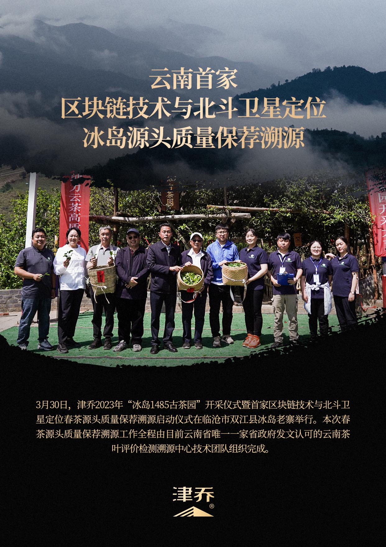 今年3月底,津乔就进行了“冰岛1485古茶园”溯源认证,成为云南省首家应用区块链技术与北斗卫星定位实施源头质量保荐溯源的企业。