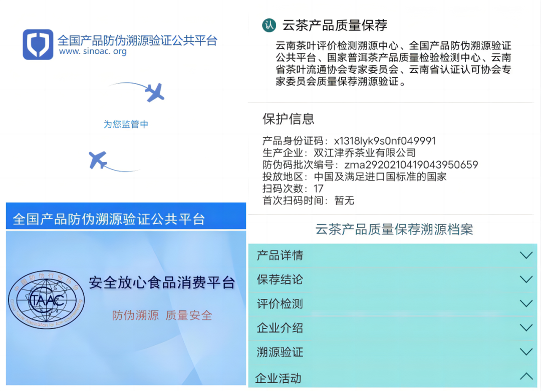 技术团队按照标准流程,完成源头溯源工作后,将全过程溯源关键信息上线到“全国产品防伪溯源验证公共平台”,消费者可扫“云茶标贴”验证,看到津乔“冰岛1485古茶园”春茶源头溯源的全过程可追溯信息及区块链的应用,消费者可放心选择。