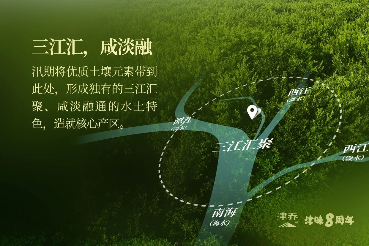 这里位于广东珠江三角洲西南部,每年汛期西江会将优质土壤元素带到银洲湖,再与潭江水交汇,在南海海水倒灌时形成独有的“三江汇集”“咸淡融通”水土特色,其丰富的营养元素和海水盐类成就了柑园土壤高营养和高盐度的特殊环境。