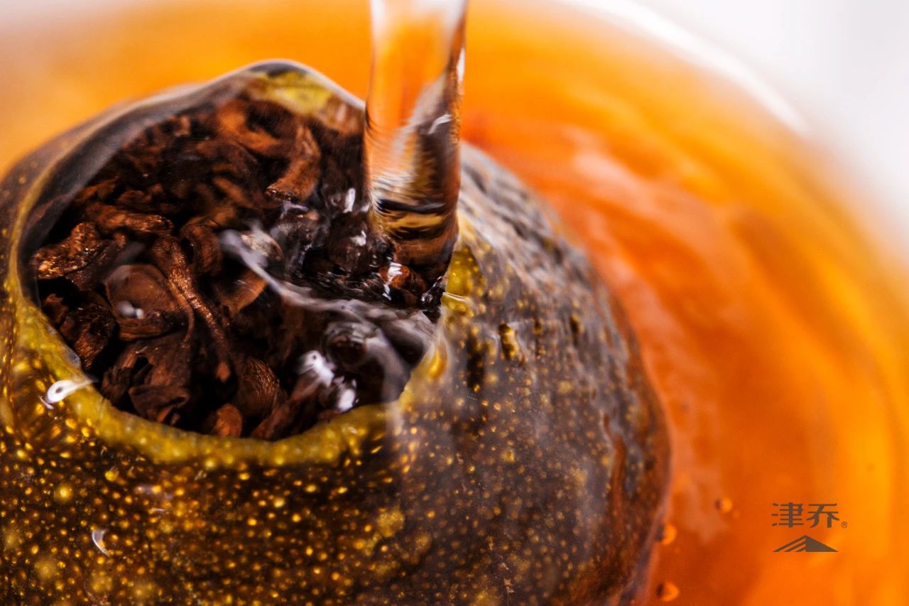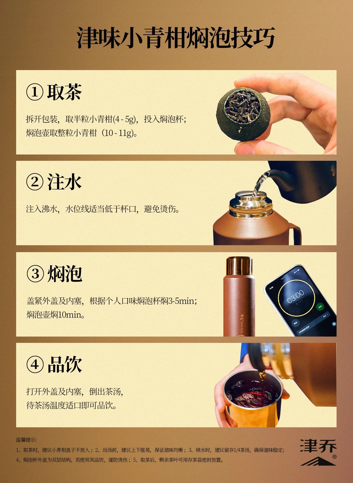 那么,怎么焖泡小青柑更好喝呢?经过津乔茶艺师多番尝试,最终测试出了风味绝佳的焖茶杯泡法: