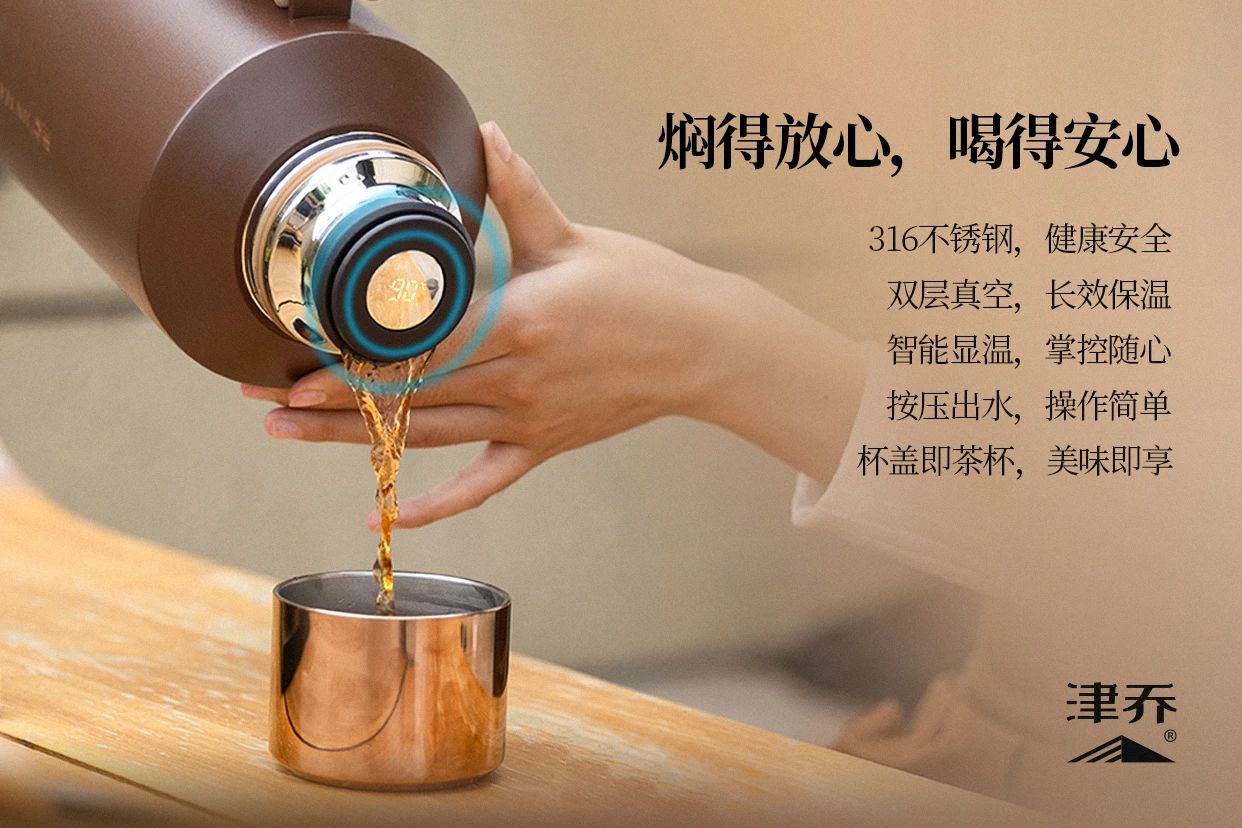 316不锈钢材质,健康安全;内胆双层真空,保温更好更长;内置茶隔,茶水分离,茶汤清澈;出水口实时温显,掌控随心;按压出水,操作简单,杯盖就是小茶杯,美味即享。