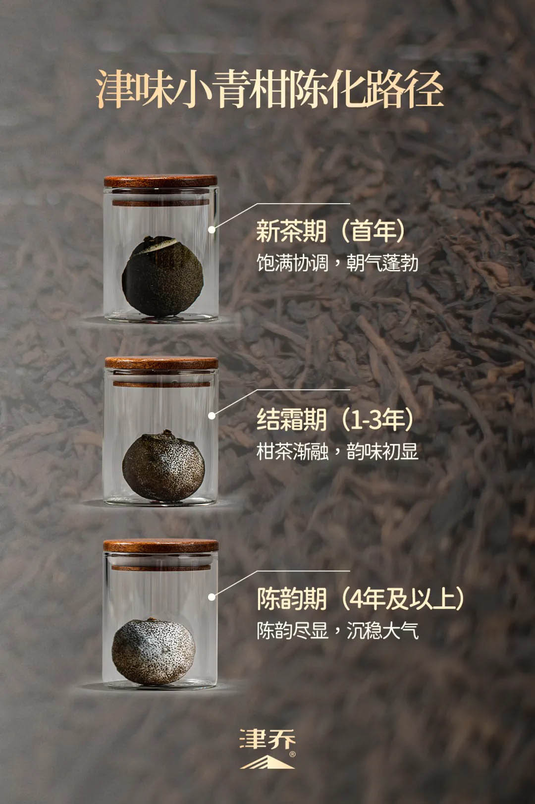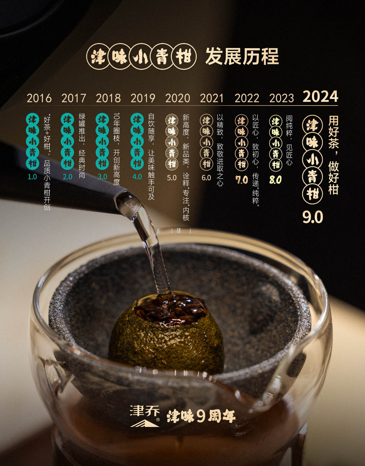 这其中,以精选新会核心产区柑果,优质勐库大叶种年份熟茶,传统半生晒工艺等核心优势为依托,津乔从2016年第一罐津味小青柑诞生至今,一推出市场既成为爆品代表作。9载光阴,数十万人种草品饮,好评率几近100%,专业化、品质化、生活化,津味小青柑已经成为市面上响当当的“特金小青柑”。