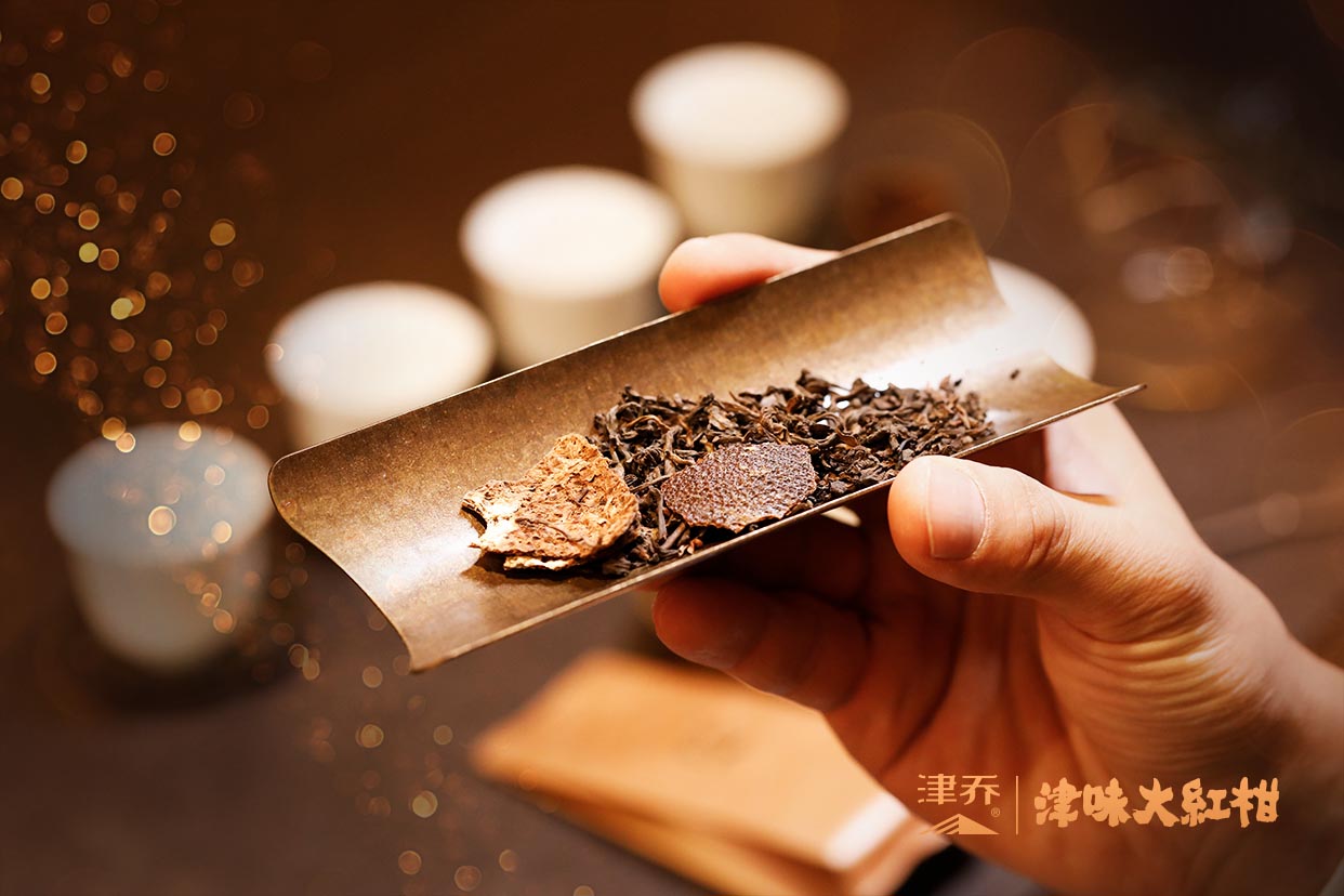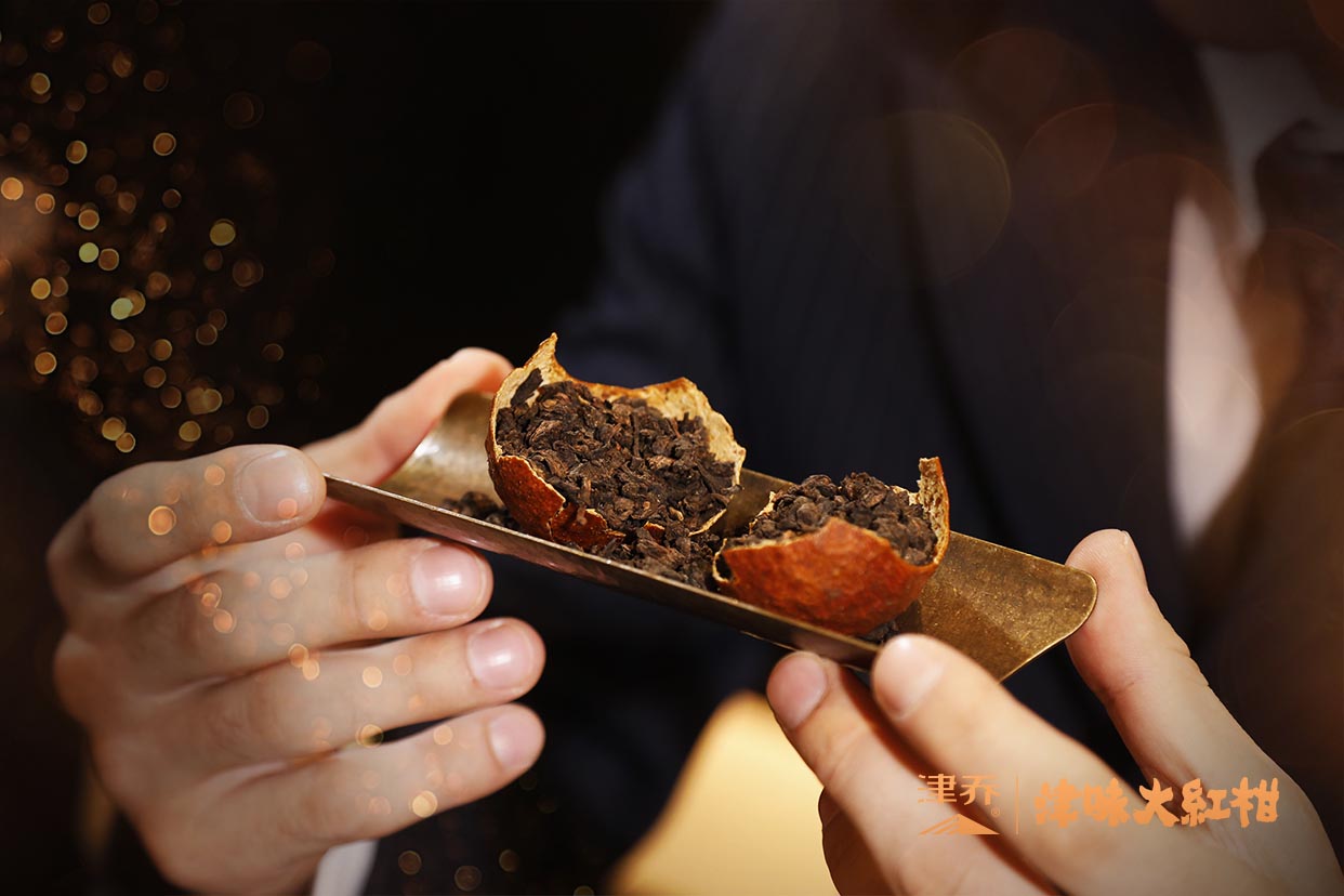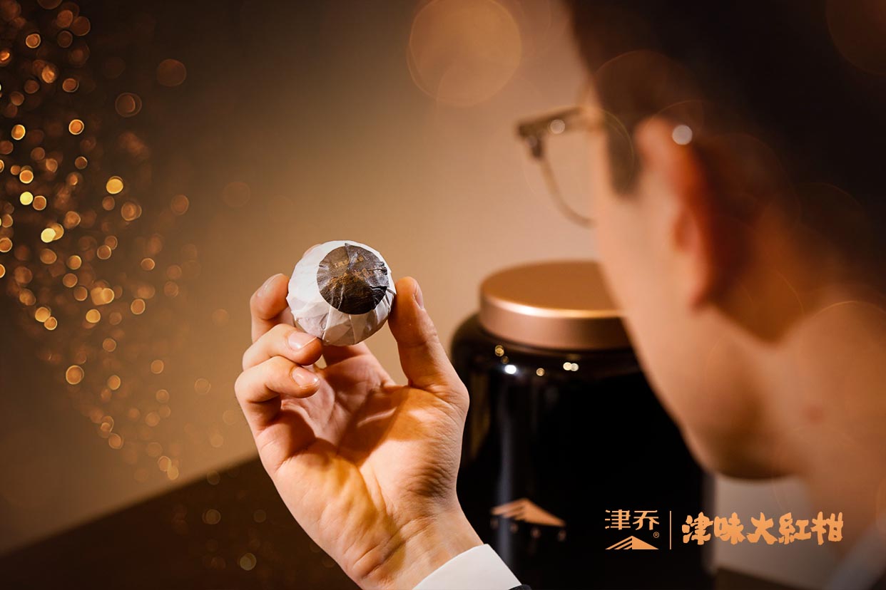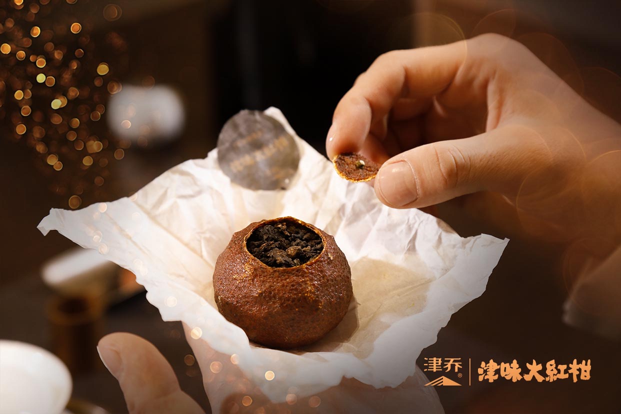 茶品精选新会核心产区的优质柑果,搭配陈年古树熟茶,于2018年制作成品后,入藏津乔原厂专业干仓。