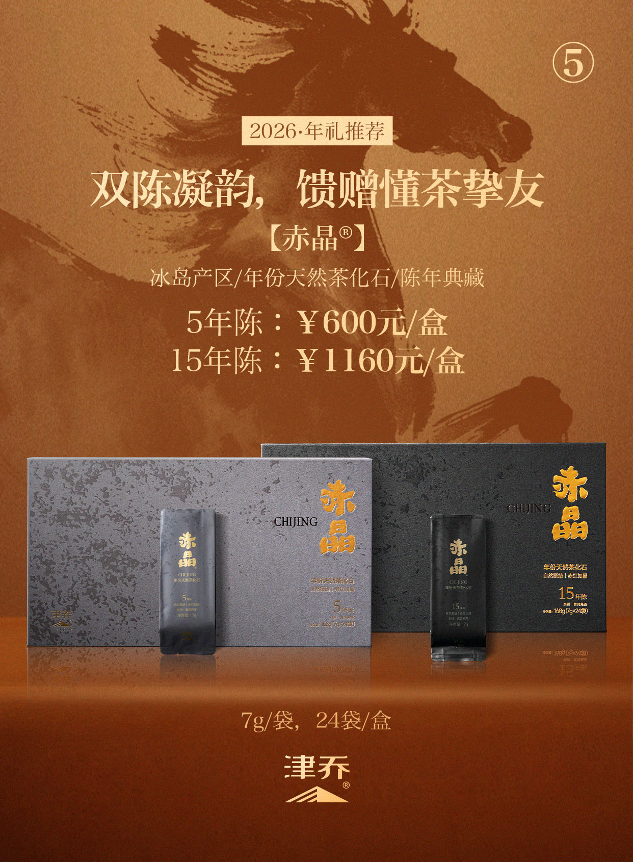 作为津乔核心IP产品,全新升级的“赤晶®”推出“5年陈“、“15年陈”双版本,均源自冰岛产区古树春料发酵的熟茶原料,经人工精细筛选后,甄选老茶头中最精华部分制作。延续初代“醇厚温润”的经典韵味,冲泡后香气层次丰富,水路细腻,滋味醇厚,暖意绵长,是赠友佳选。