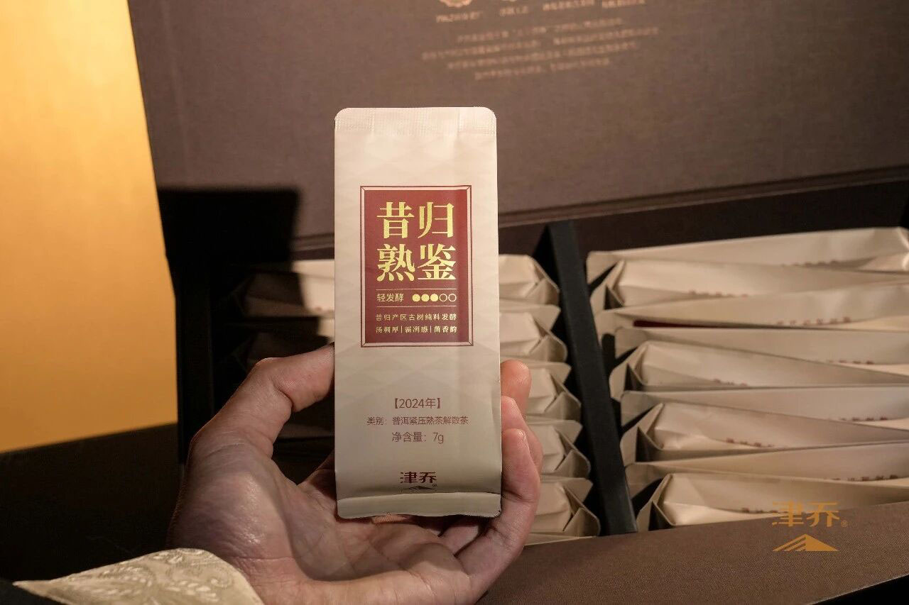 昔归熟鉴,甄选昔归产区200-500龄古树春茶为原料,以津乔逾15年熟茶技艺轻发酵淬炼而成,茶汤红浓醇厚,入口绵糯顺滑,甜香中带着昔归特有的菌香韵,无仓味、杂味的纯净口感,深度诠释“汤稠厚、霸冽感、菌香韵”的独特气韵,尽显高端熟茶的绝佳质感。