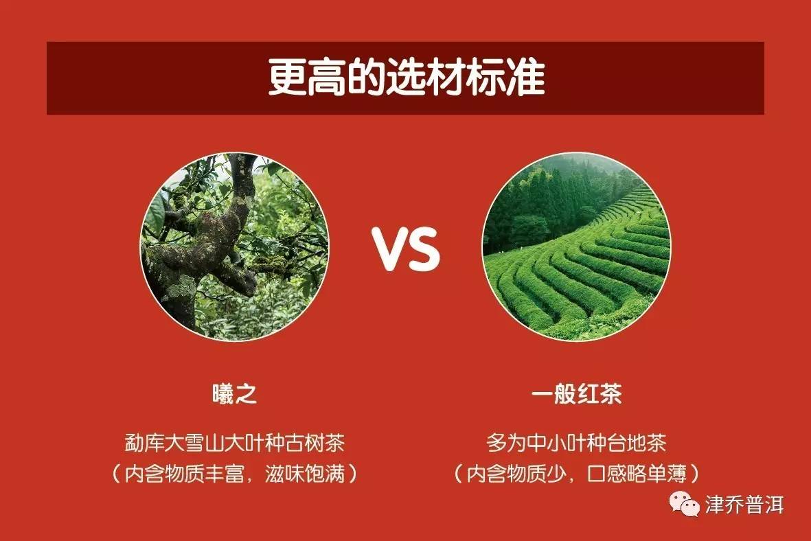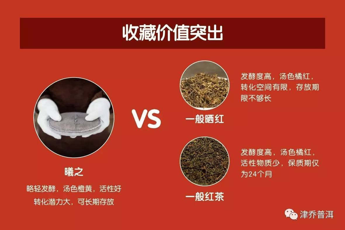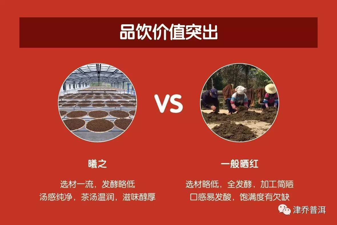 从发酵工艺上来看,曦之的发酵度略低,保留了大量活性物质以供后期转化,并压成饼,从而可长期收藏,比一般红茶和一般晒红的存储潜力还要大。