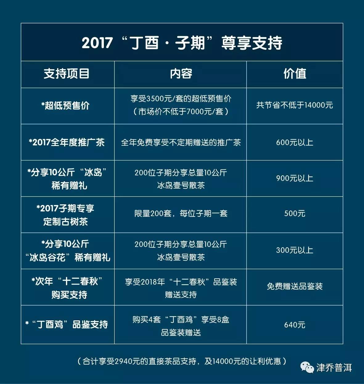 “子期”源于“知音”典故,人生贵相知,津乔以“子期”作为年度VIP客户的称谓,表达对津乔普洱“知音”的敬意之心。2017年,津乔给到了“子期”非常丰厚的“7重大礼”,直接享受全年合计2940元的茶品赠礼。