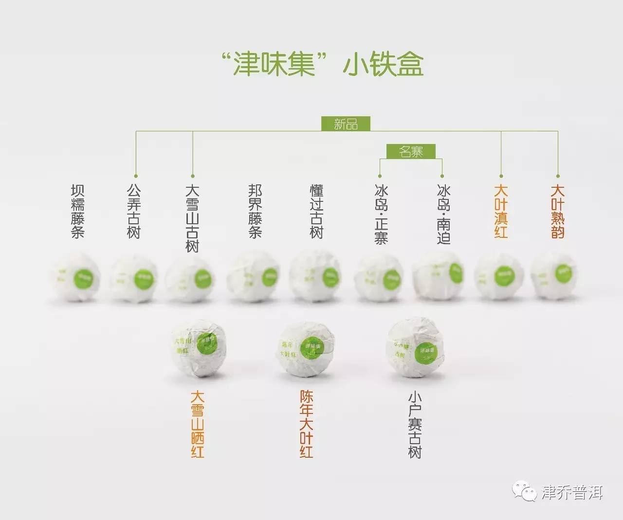 “津味集”小铁盒:12粒/盒。(12粒勐库不同茶品)