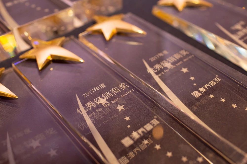 经销商大会答谢晚宴,津乔准备了不同的奖项对2017年在品牌推广及销售方面成绩突出的伙伴给予了肯定和鼓励。