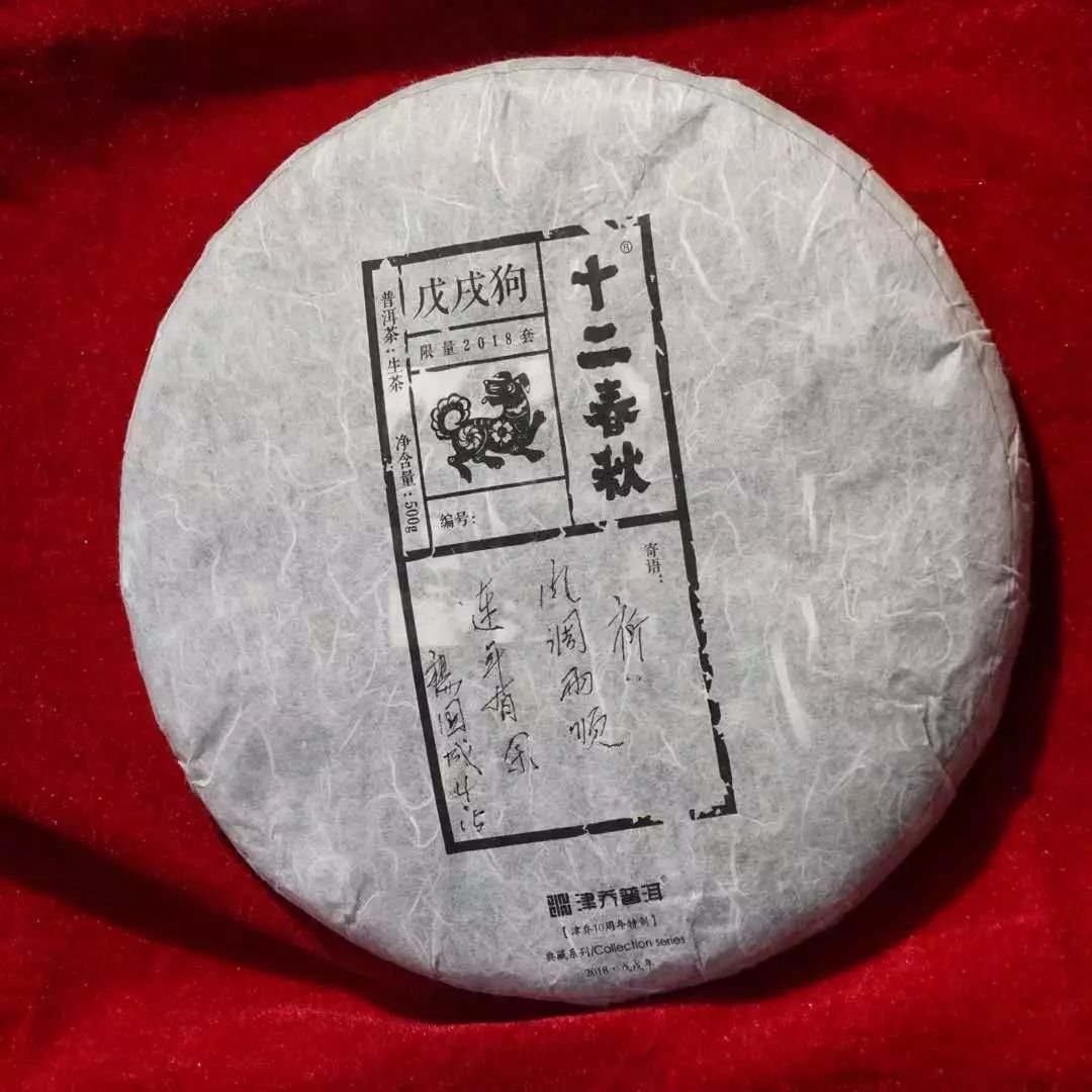 津乔祭拜茶品“十二春秋·戊戌狗”,董事长杨国成先生题词祈愿:风调雨顺,连年有余。