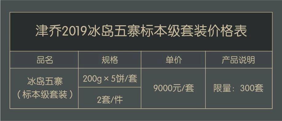 冰岛五寨与2019年4月11日参考往年定价,首度发布价为7800元/套。介于2019年春茶减产、茶价格上浮情况,上市价较最初发布有所上浮。为了照顾津粉感受,津乔茶业特别给到政策支持:即日起5日内订购仍可享受4月发布价,7月21日0时起恢复9000元/套。
