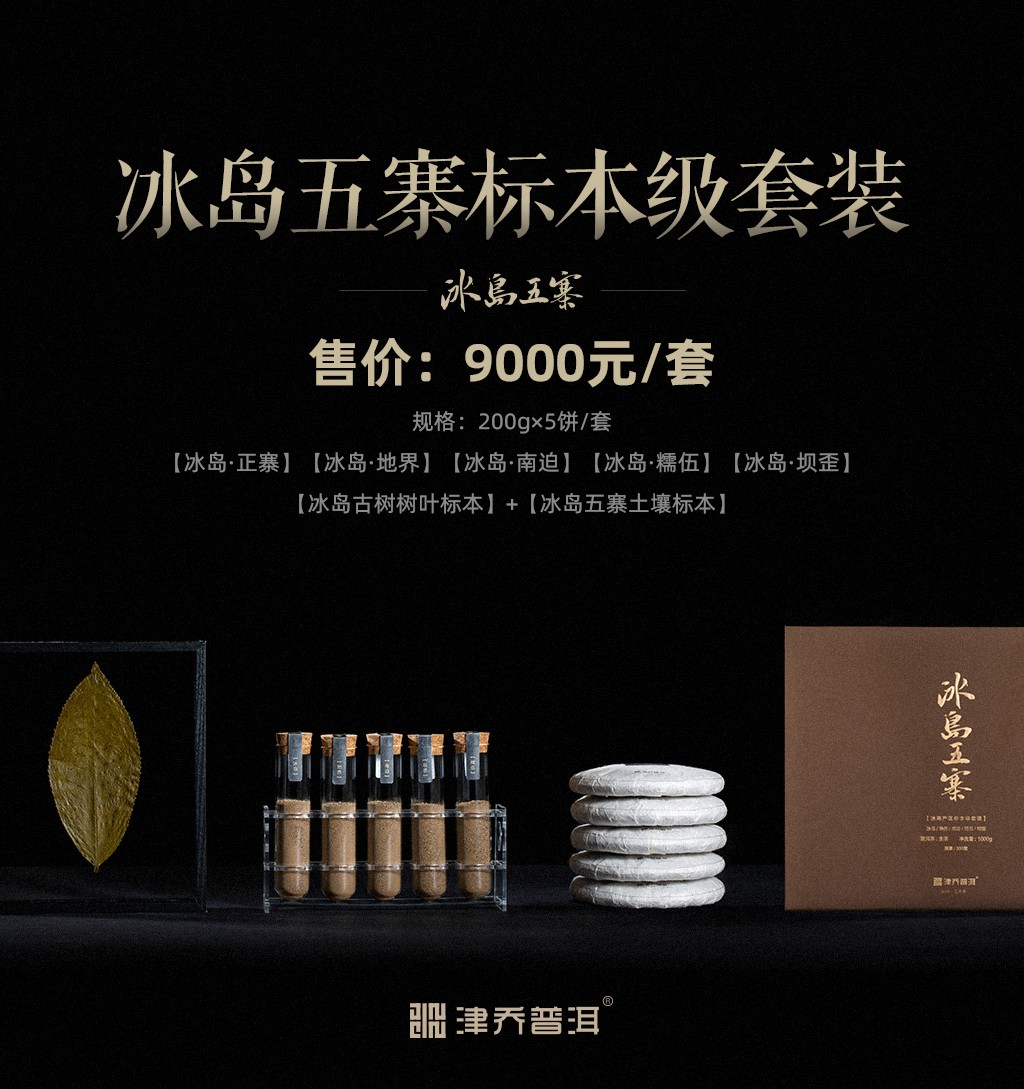 “冰岛五寨”不仅采用了冰岛五寨春季古树纯料诠释,更精心融入融入冰岛正寨古树树叶标本及冰岛五寨土壤标本,用津乔最纯粹的方式诠释“冰岛”大美滋味。