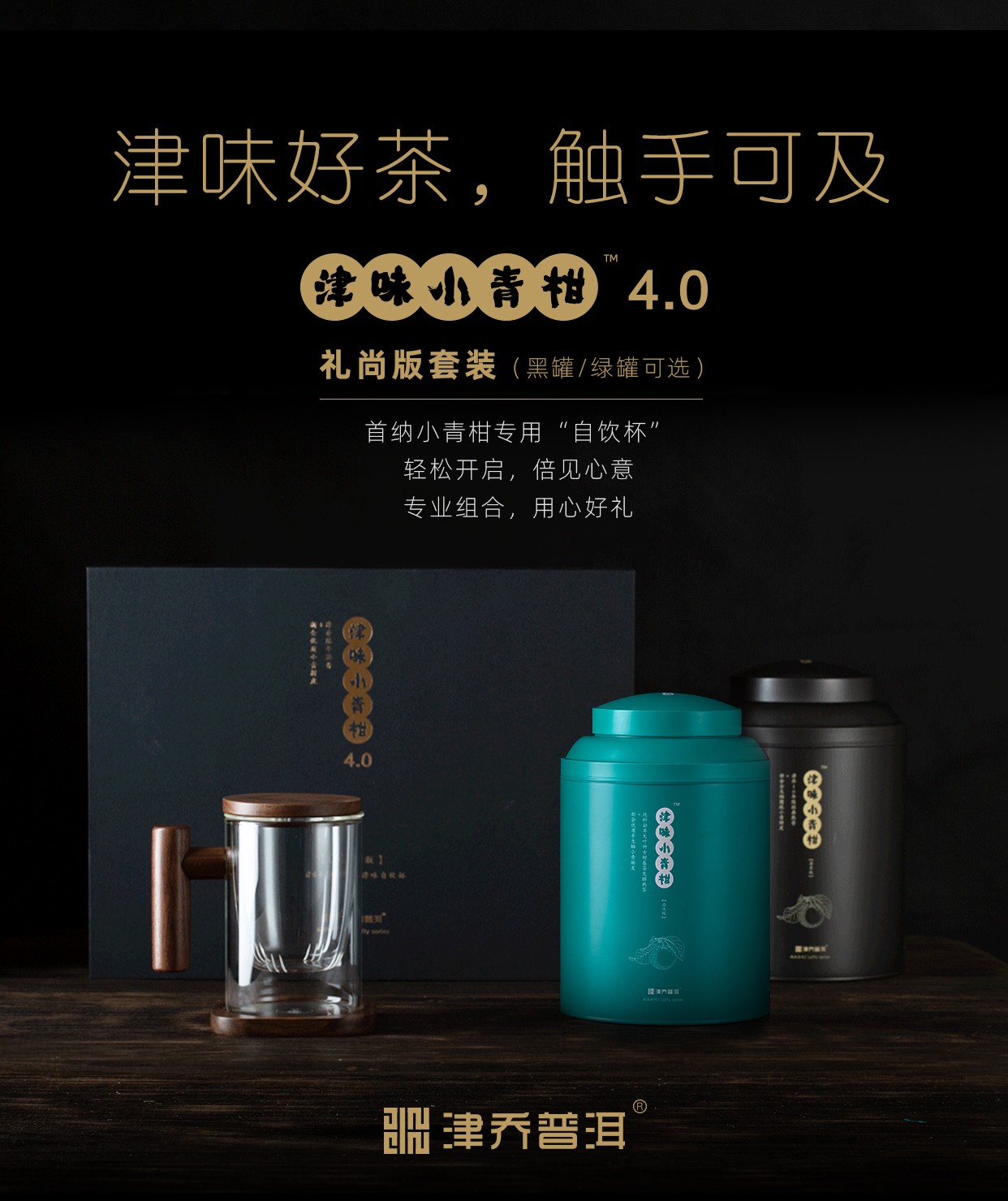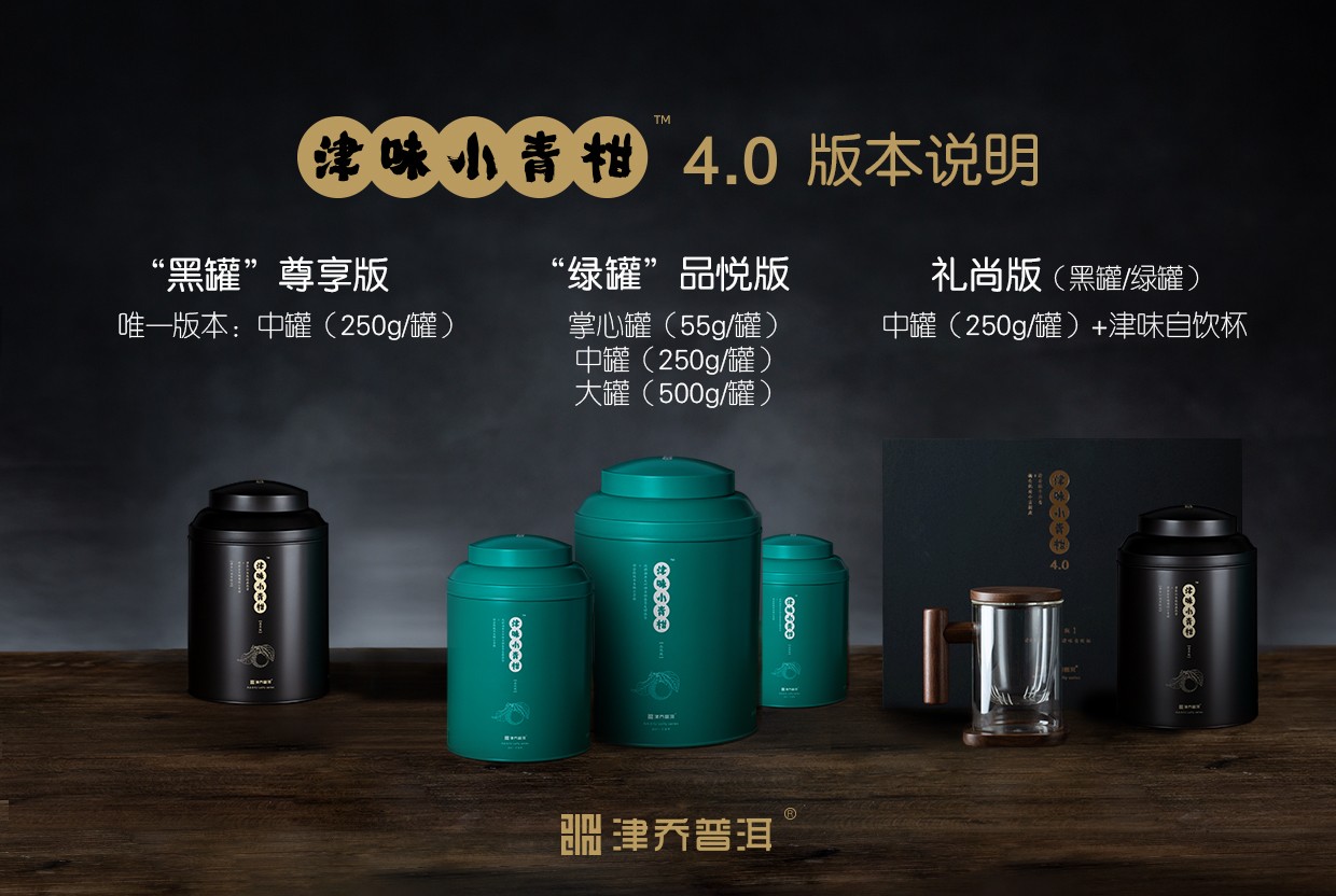 津味小青柑4.0全系列,以三版本同步推出:经典(绿罐)品悦版、顶级(黑罐)尊享版,礼尚版(自饮杯+黑罐/绿罐)。