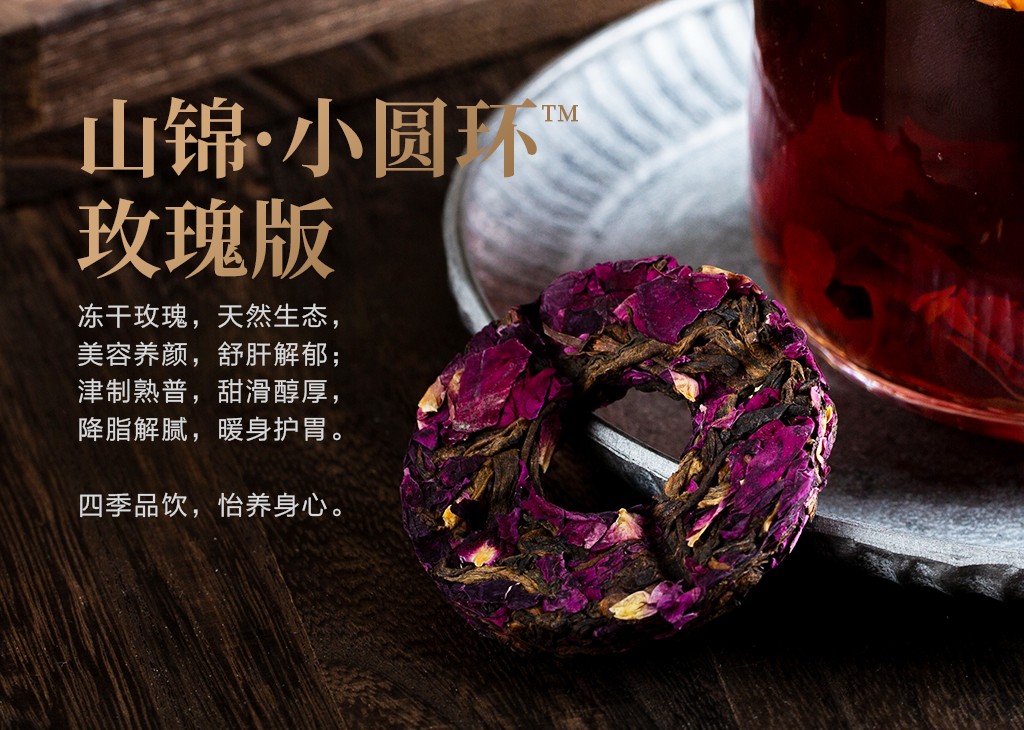 山锦·小圆环™玫瑰版,精选津乔陈年熟普,并结合云南冻干墨红玫瑰为原料制成。有美容养颜,舒肝解郁之功效。