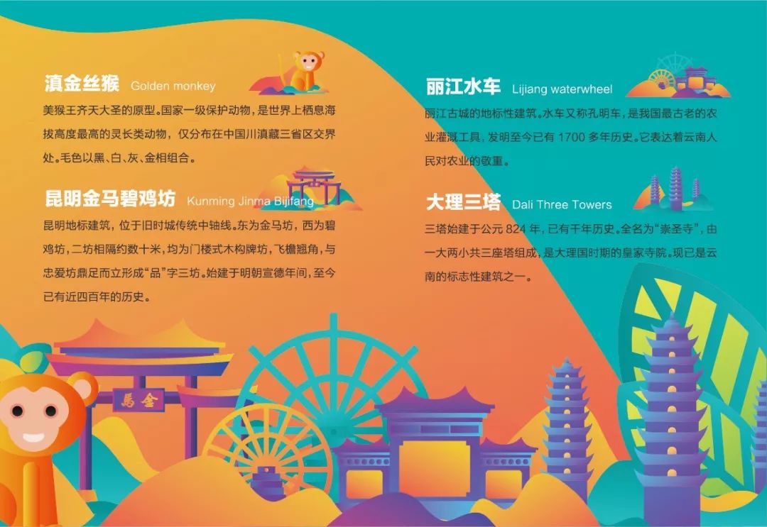 少数民族、普洱茶、沧源崖画、犀鸟、亚洲象、绿孔雀、金丝猴、大理三塔、丽江水车、昆明金马坊。